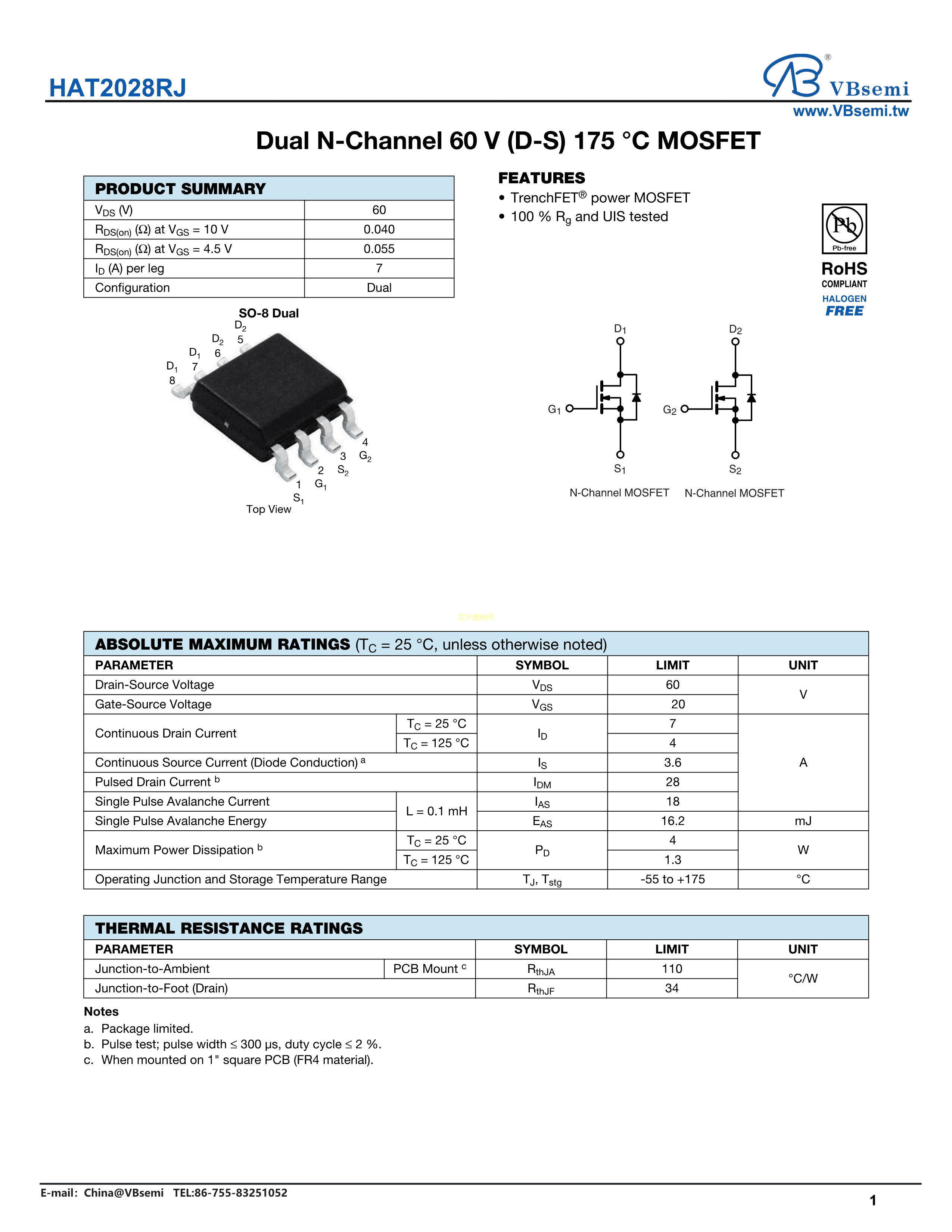 HAT2028RJ数据手册SOP-8封装VBsemi(台湾微碧)PDF规格书,中英文下载