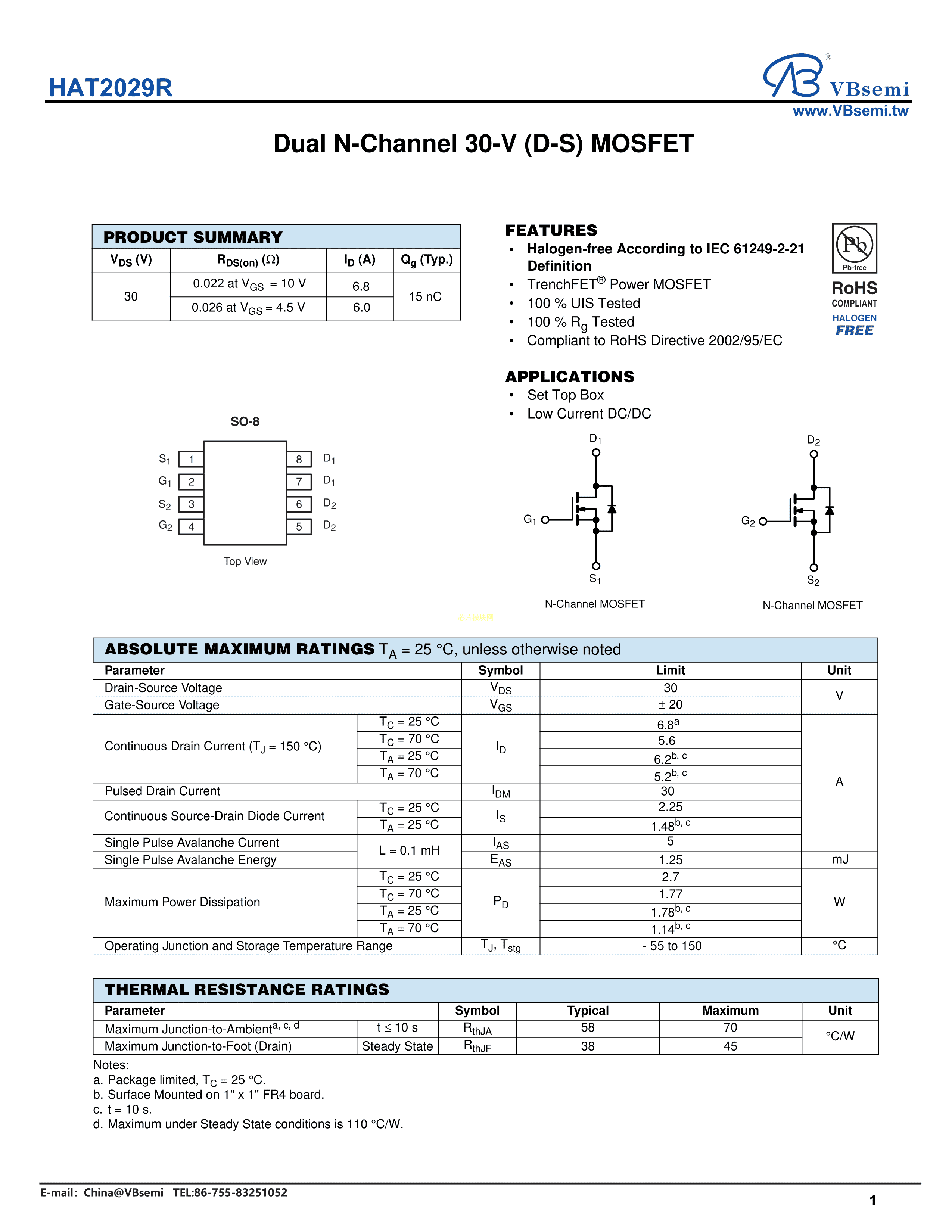 HAT2029R数据手册SOP-8封装VBsemi(台湾微碧)PDF规格书,中英文下载