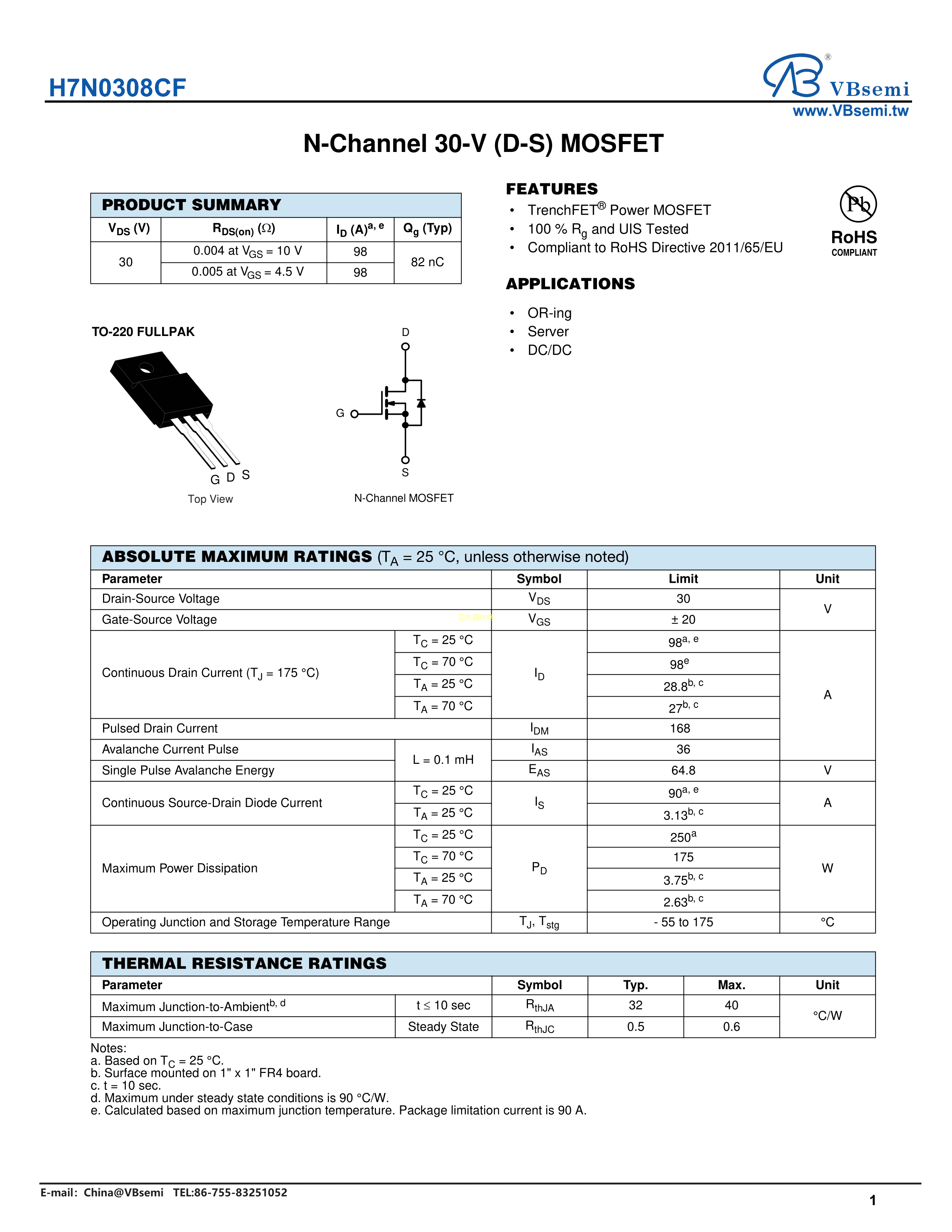 H7N0308CF数据手册TO-220F封装VBsemi(台湾微碧)PDF规格书,中英文下载
