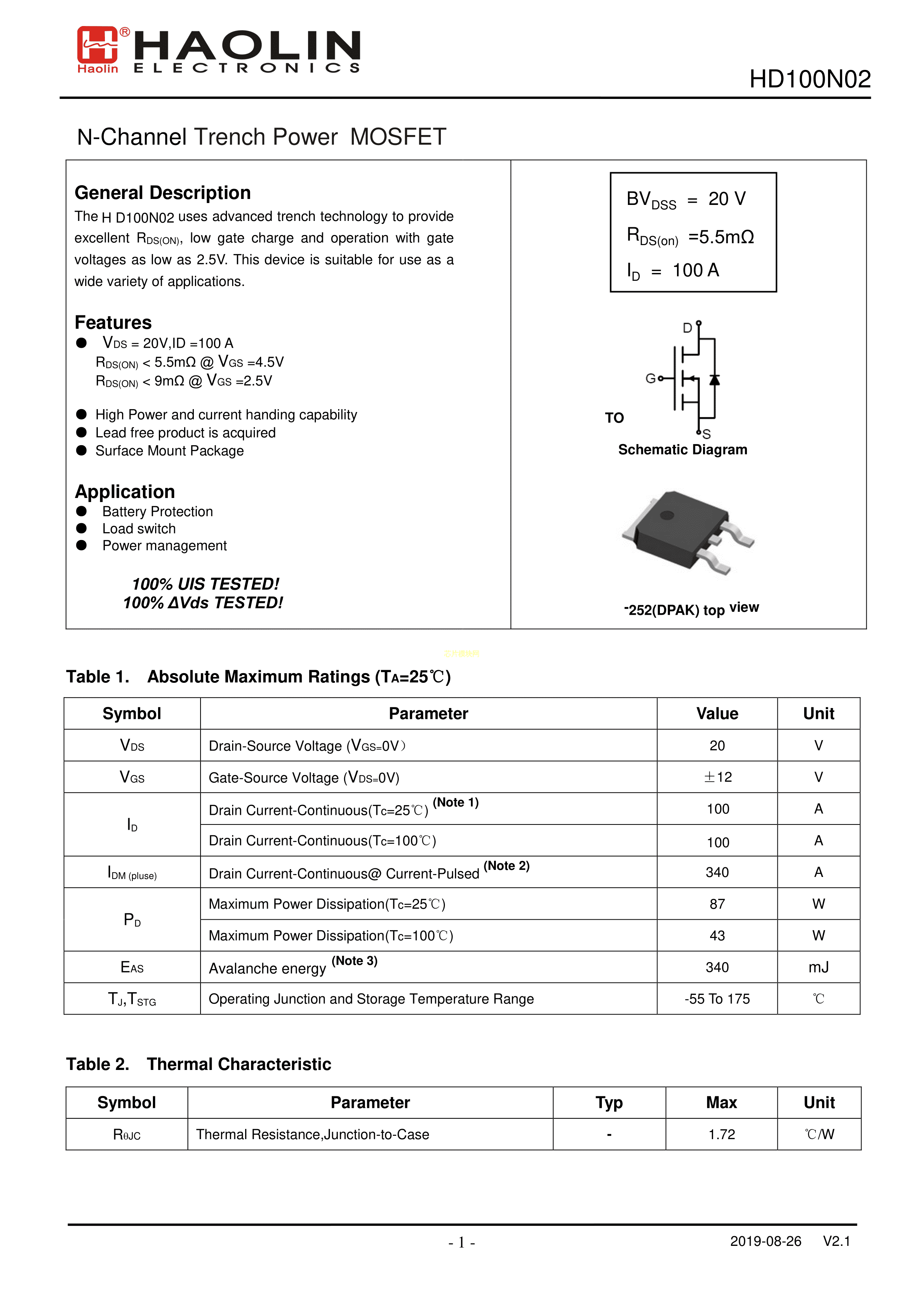 HD100N02数据手册TO-252封装HL(豪林)PDF规格书,中英文下载