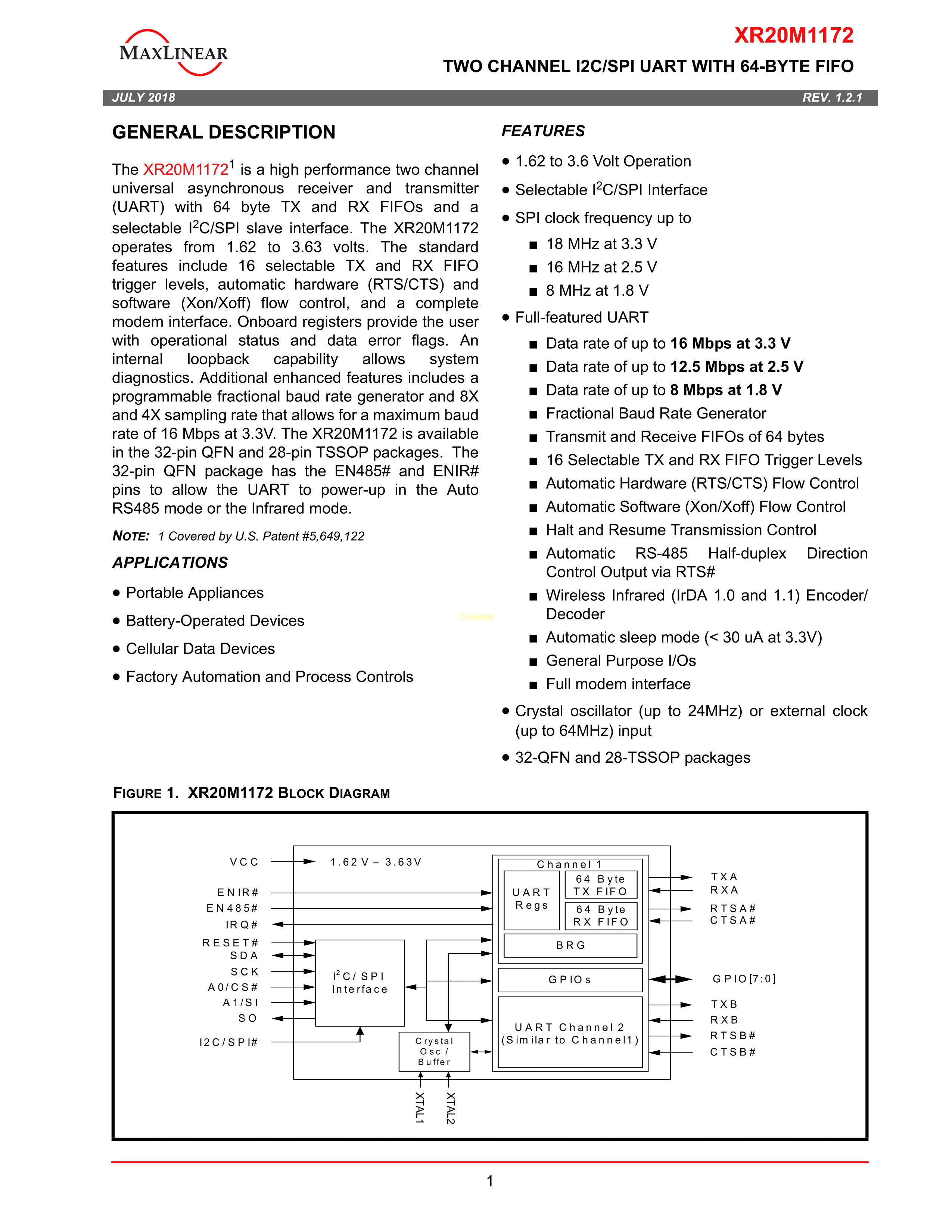 XR20M1172IL32TR-F数据手册QFN-32封装MaxLinearPDF规格书,中英文下载