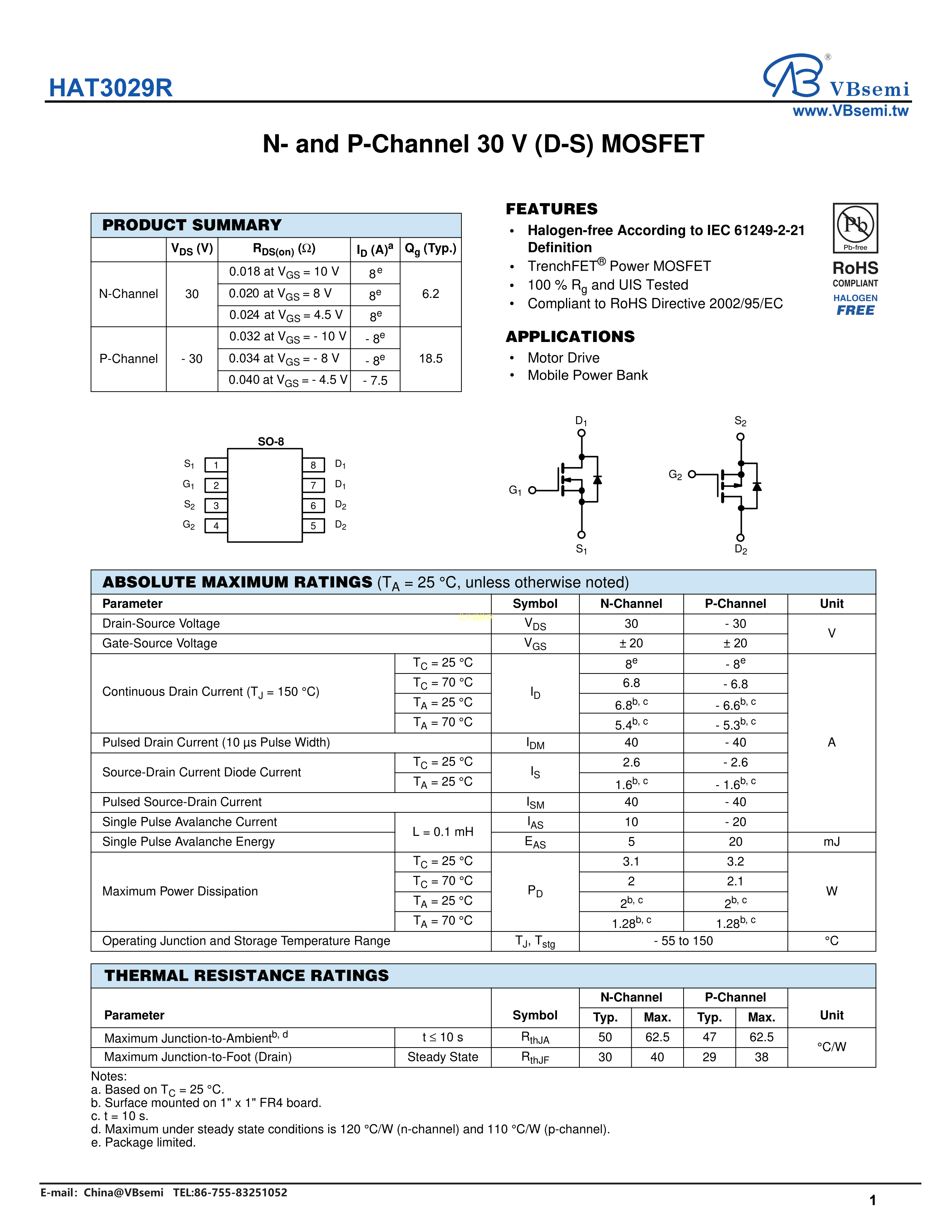 HAT3029R数据手册SO-8封装VBsemi(台湾微碧)PDF规格书,中英文下载