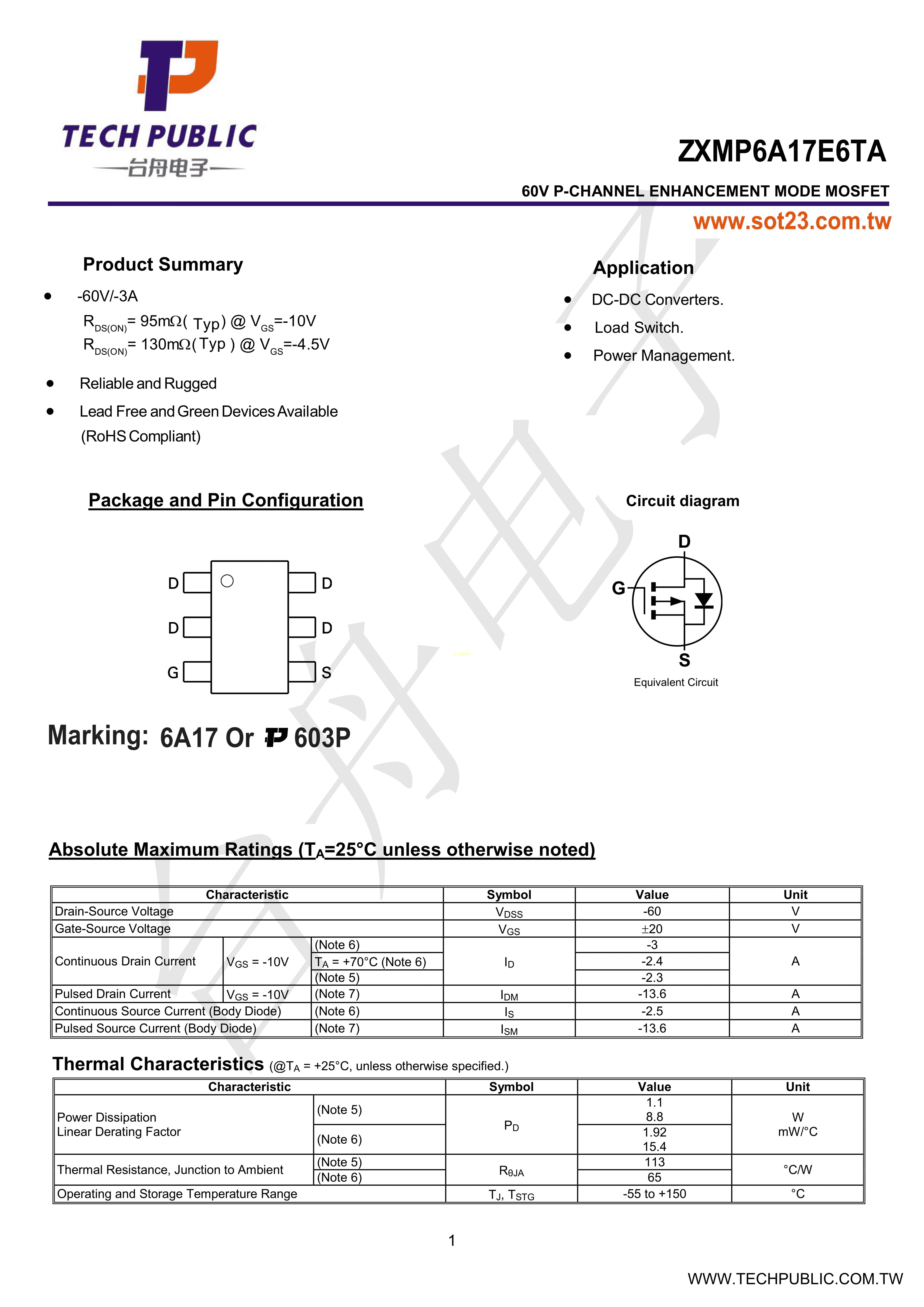 ZXMP6A17E6TA数据手册SOT23-6封装TECHPUBLIC(台舟)PDF规格书,中英文下载