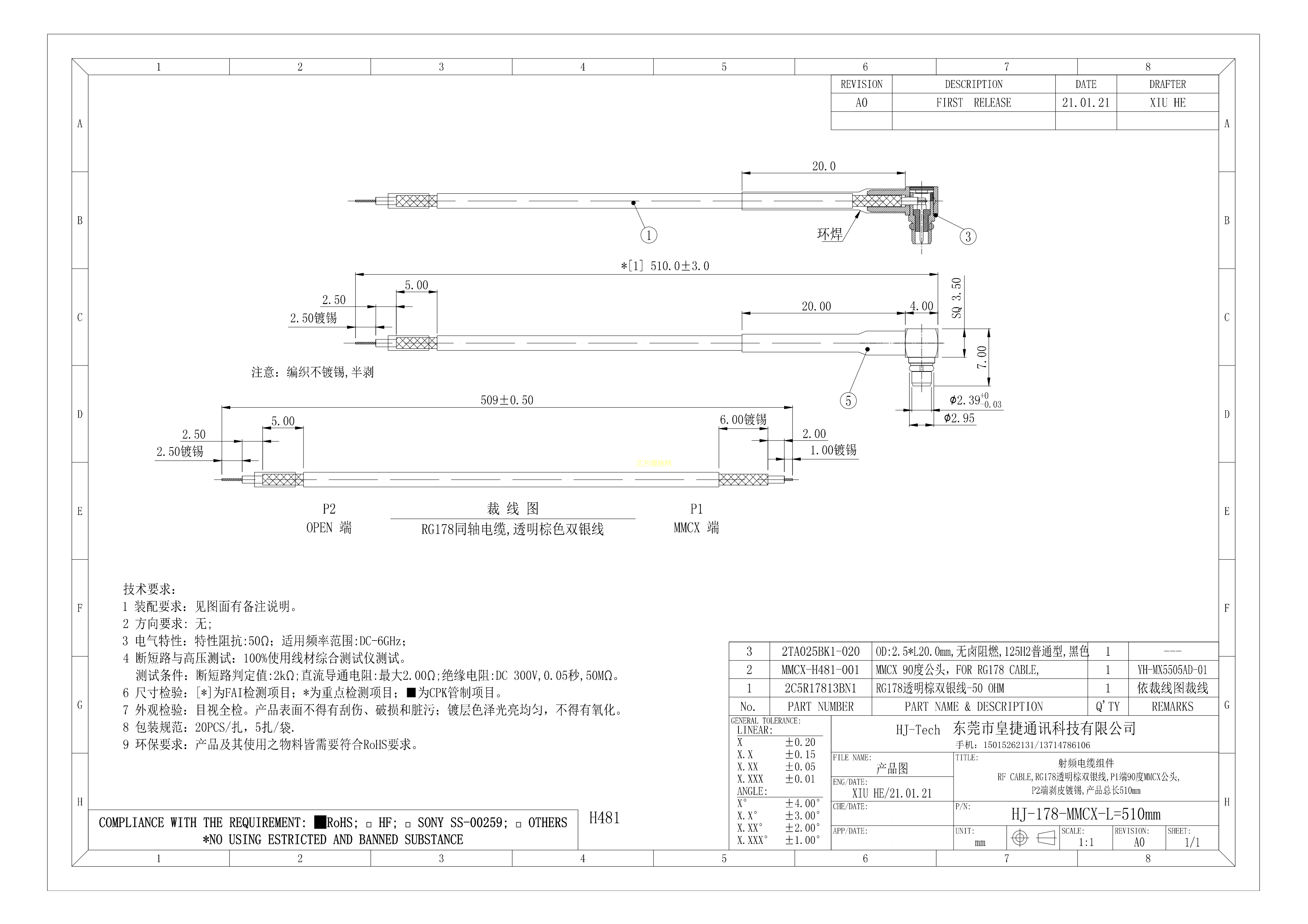 HJ-178-MMCX-L510mm数据手册-封装皇捷PDF规格书,中英文下载