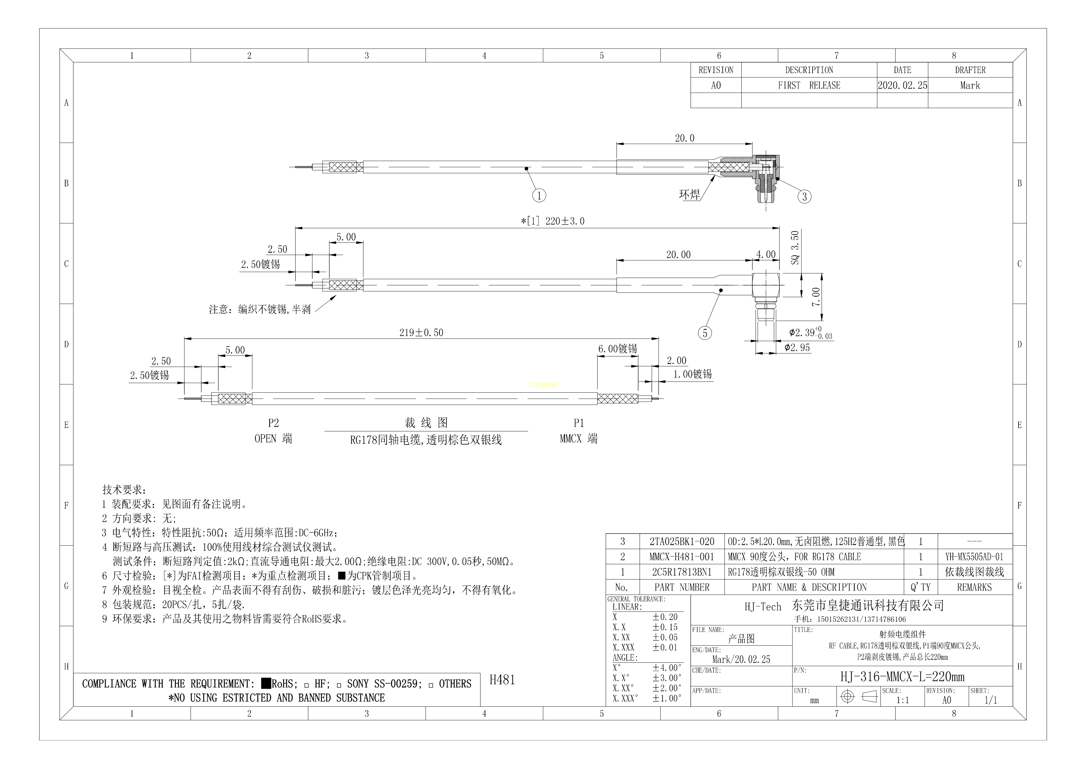 HJ-316-MMCX-L220mm数据手册-封装皇捷PDF规格书,中英文下载