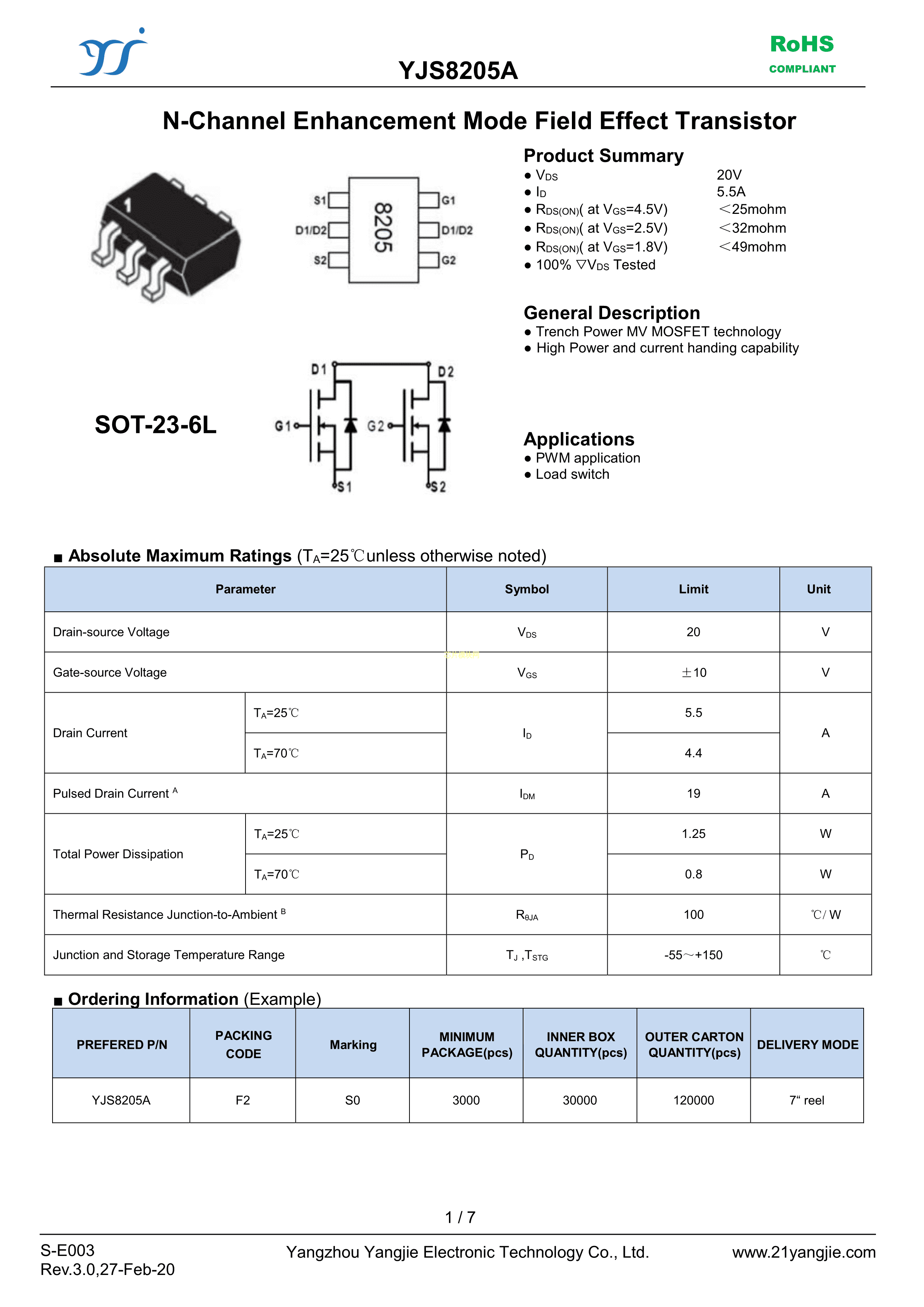 YJS8205A数据手册SOT-23-6L封装YANGJIE(扬杰)PDF规格书,中英文下载