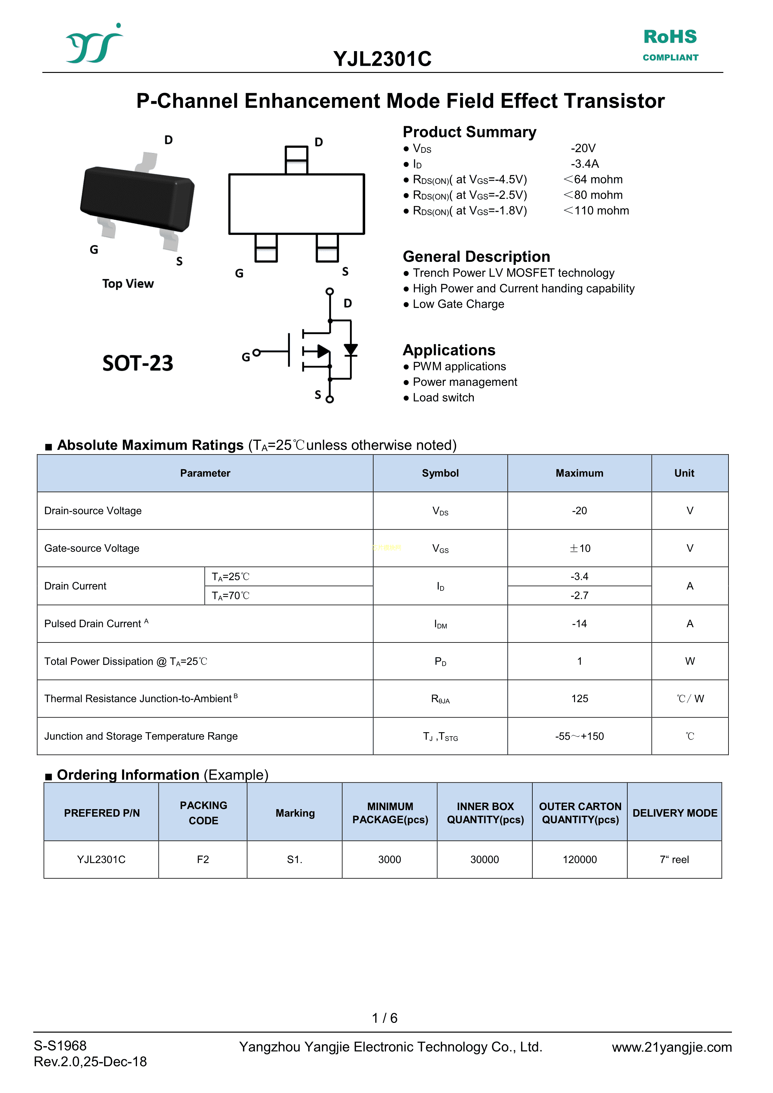 YJL2301C数据手册SOT-23-3L封装YANGJIE(扬杰)PDF规格书,中英文下载
