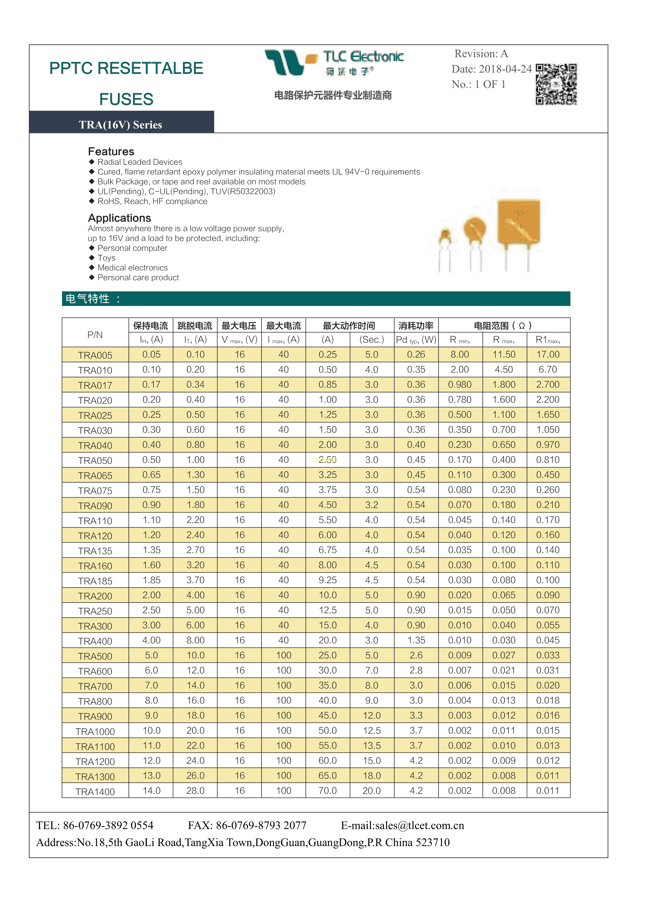 TRA020-1数据手册径向引线P5.1mmL10mm封装TLC(竞沃)PDF规格书,中英文下载