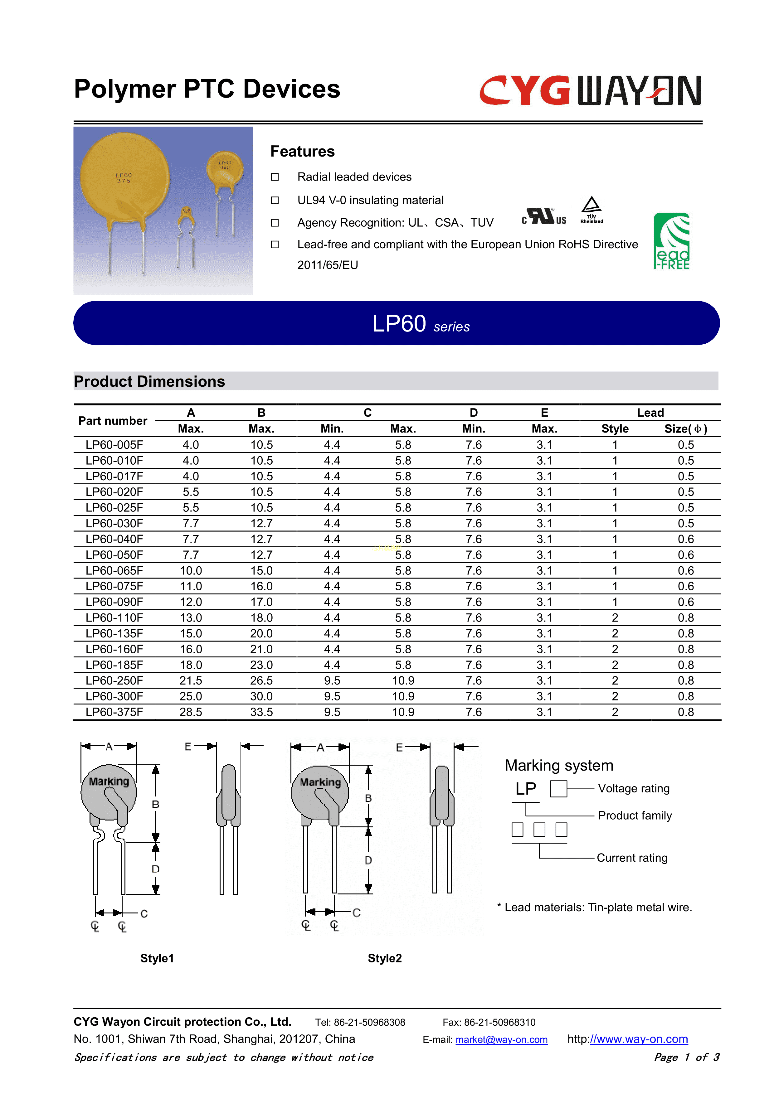 LP60-090F数据手册径向引线P5.8mm封装Wayon(上海维安)PDF规格书,中英文下载