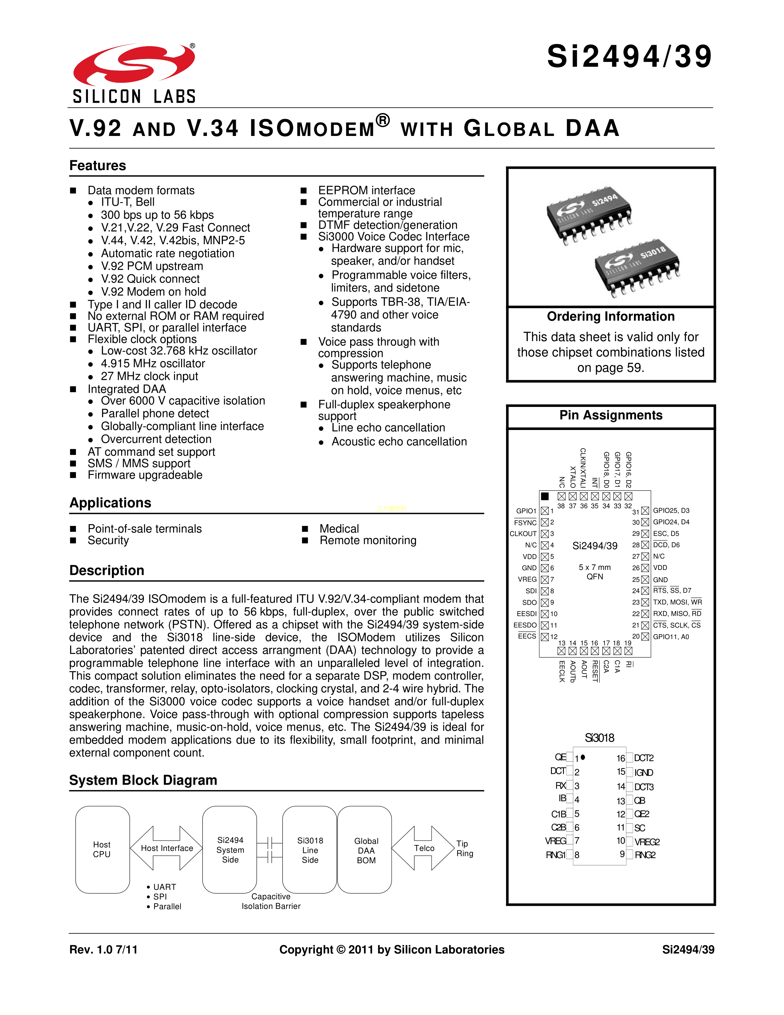 SI2494-A-GMR数据手册QFN-38(5x7)封装SILICONLABS(芯科)PDF规格书,中英文下载