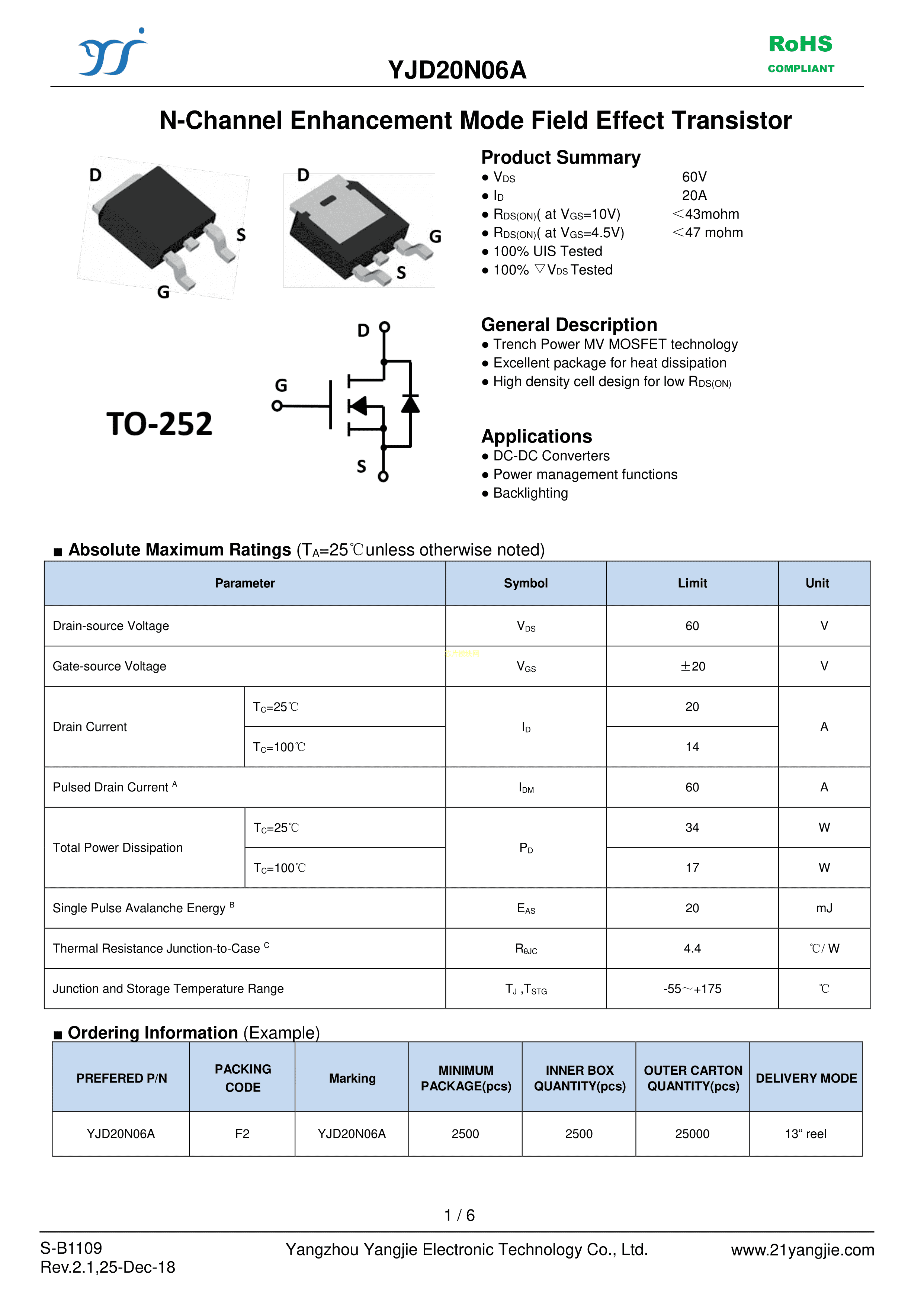 YJD20N06A数据手册TO-252封装YANGJIE(扬杰)PDF规格书,中英文下载