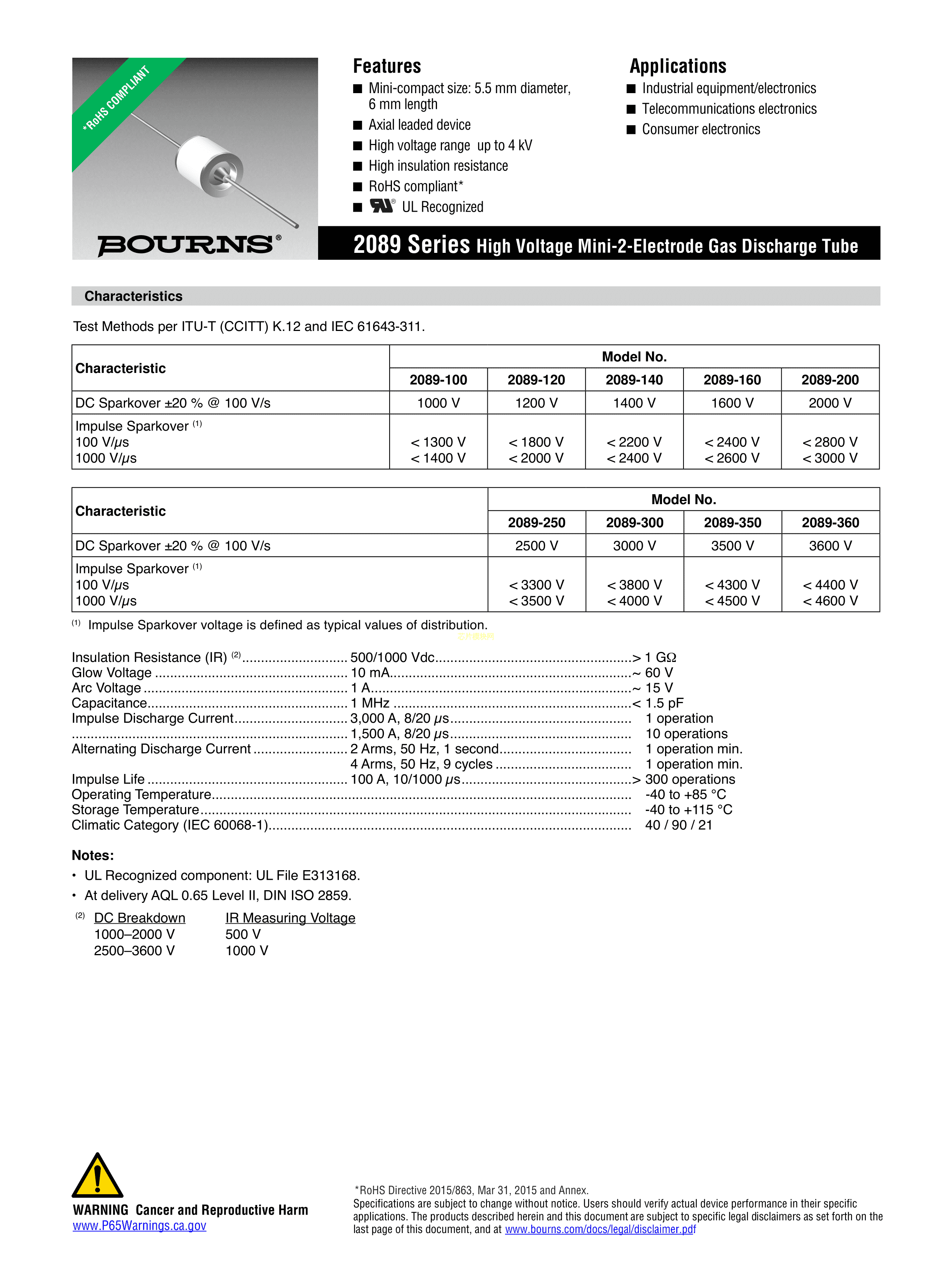 2089-300-BT1LF数据手册轴向引线封装BOURNSPDF规格书,中英文下载