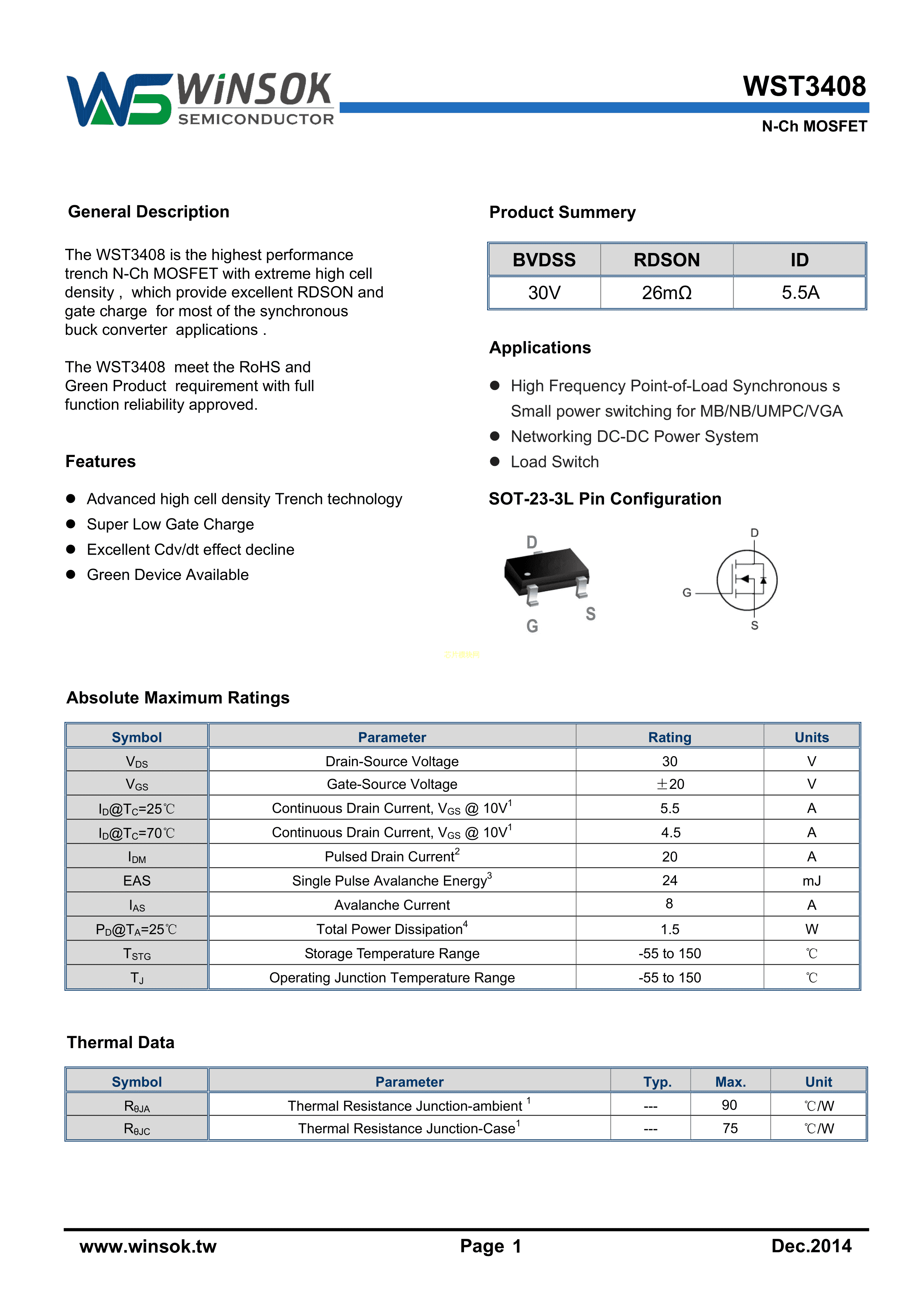 WST3408数据手册SOT-23(SOT-23-3)封装WINSOK(微硕)PDF规格书,中英文下载