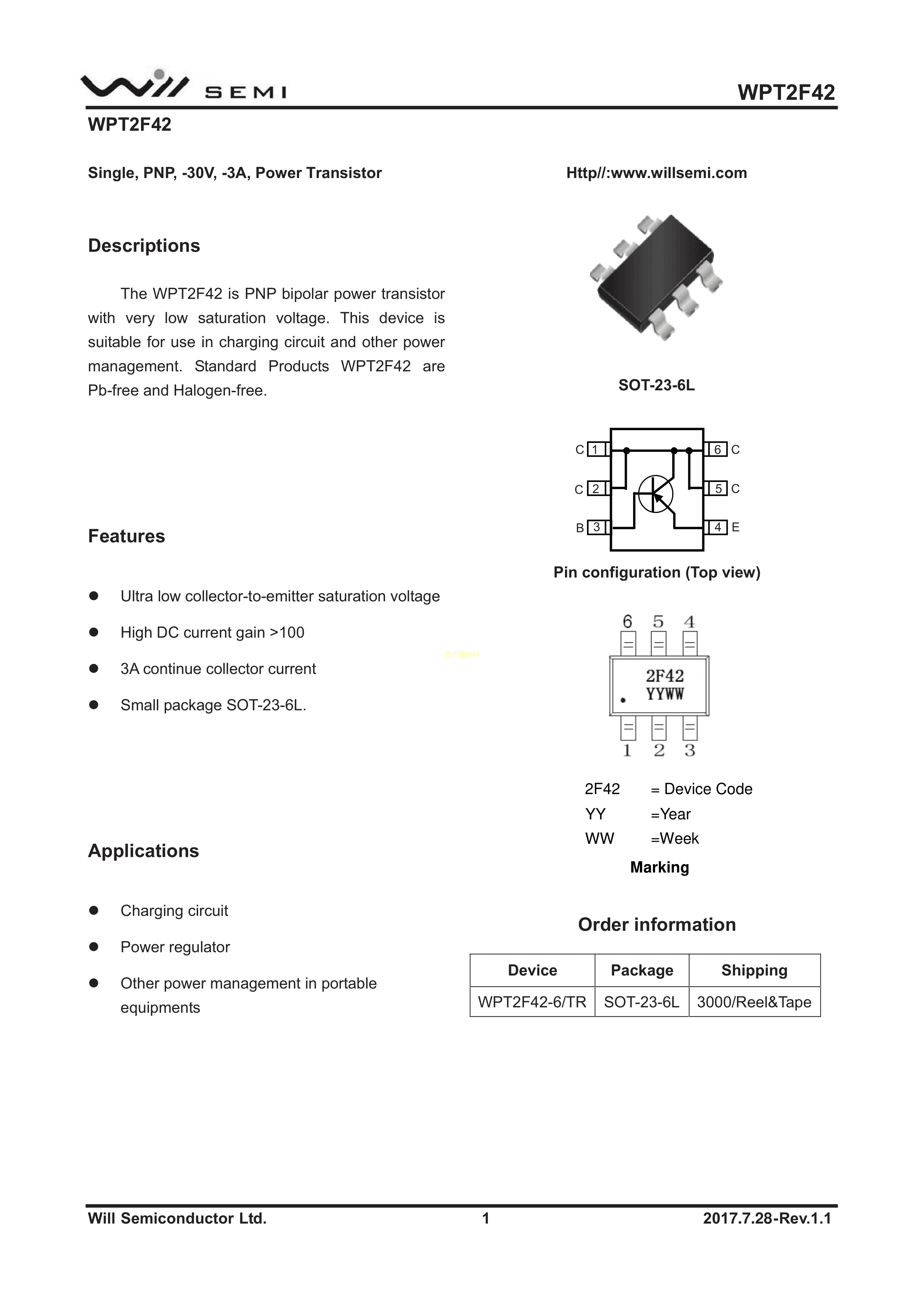 WPT2F42-6-TR数据手册SOT-23-6L封装WILLSEMI(韦尔)PDF规格书,中英文下载