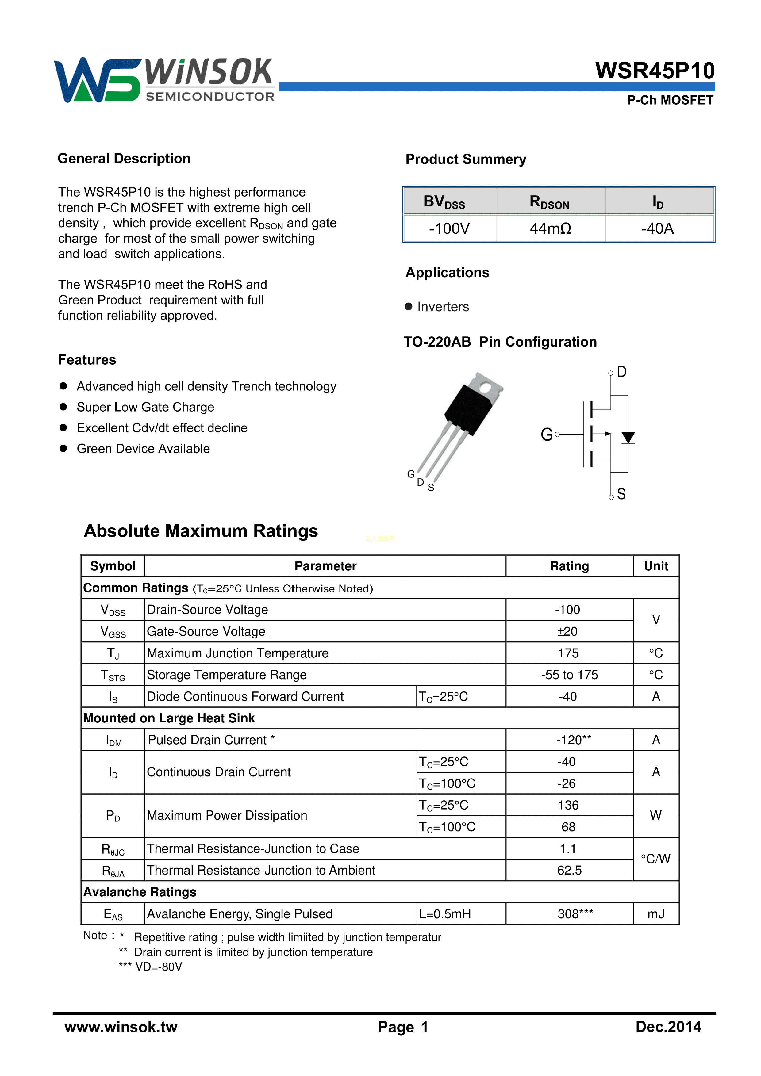 WSR45P10数据手册TO-220(TO-220-3)封装WINSOK(微硕)PDF规格书,中英文下载