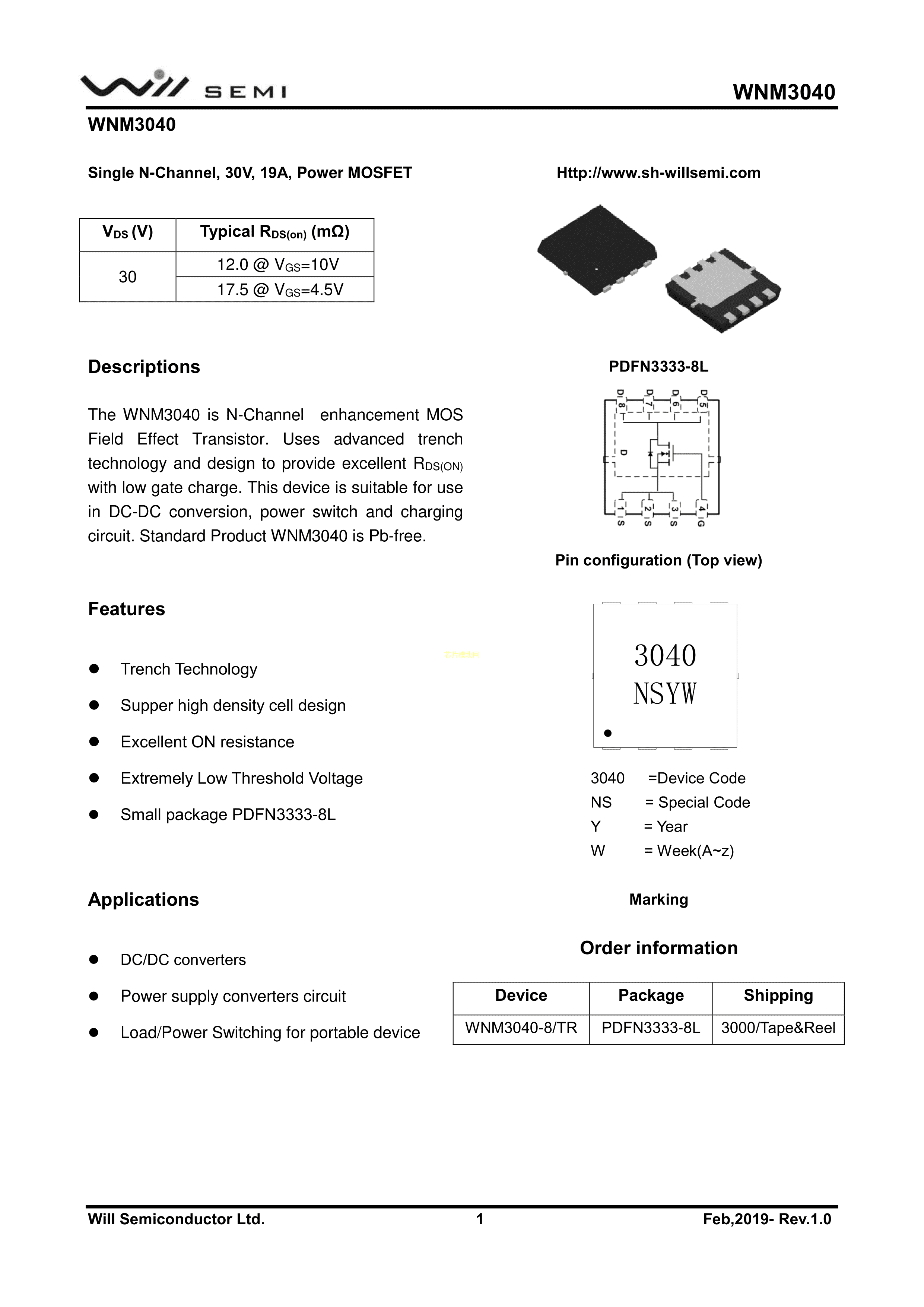 WNM3040-8-TR数据手册PDFN3333-8L封装WILLSEMI(韦尔)PDF规格书,中英文下载