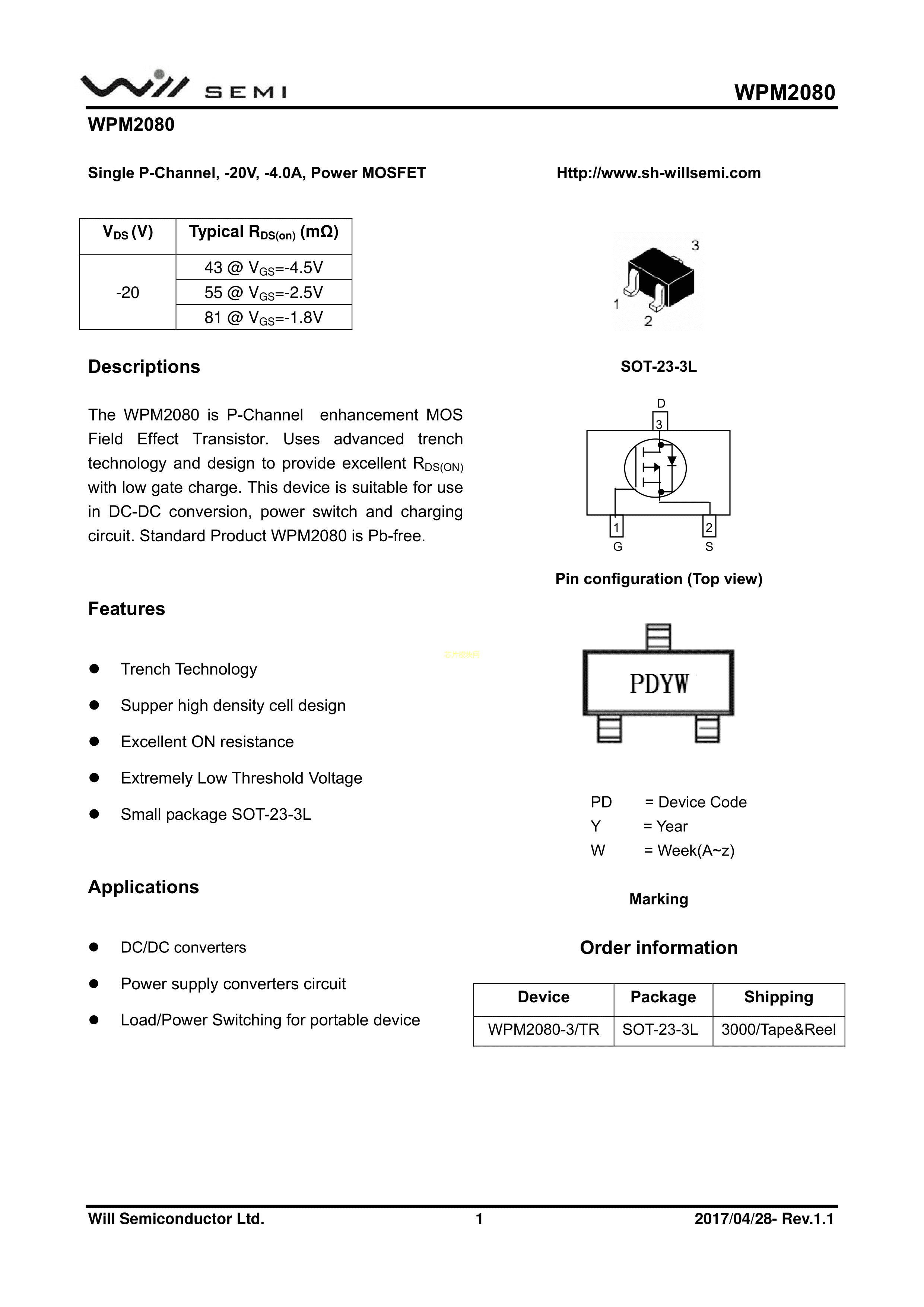 WPM2080-3-TR数据手册SOT-23-3L封装WILLSEMI(韦尔)PDF规格书,中英文下载