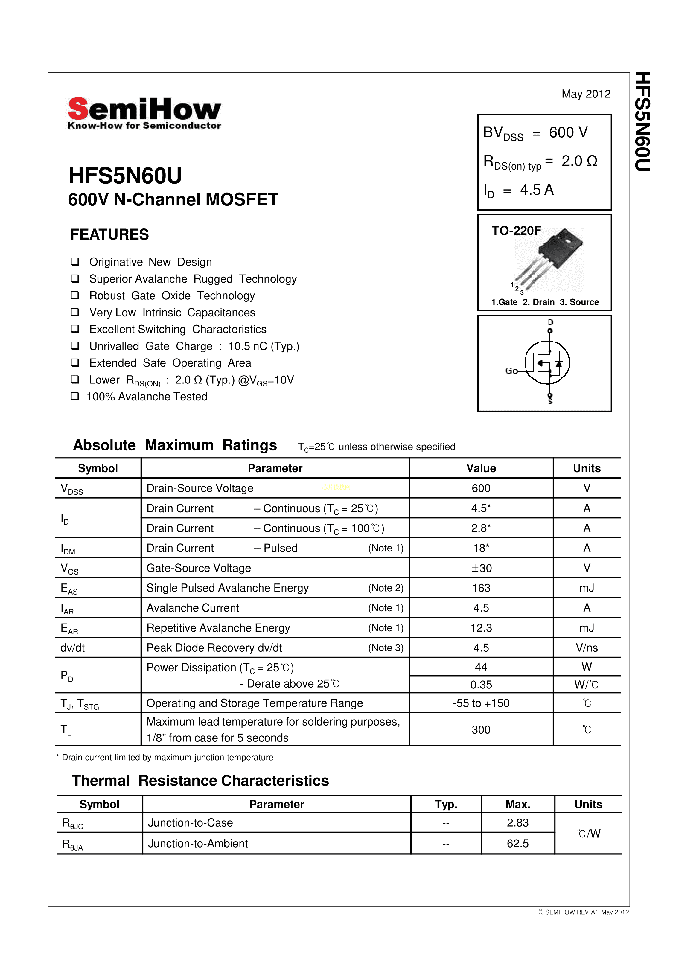 HFS5N60U数据手册TO-220F封装SemiHowPDF规格书,中英文下载