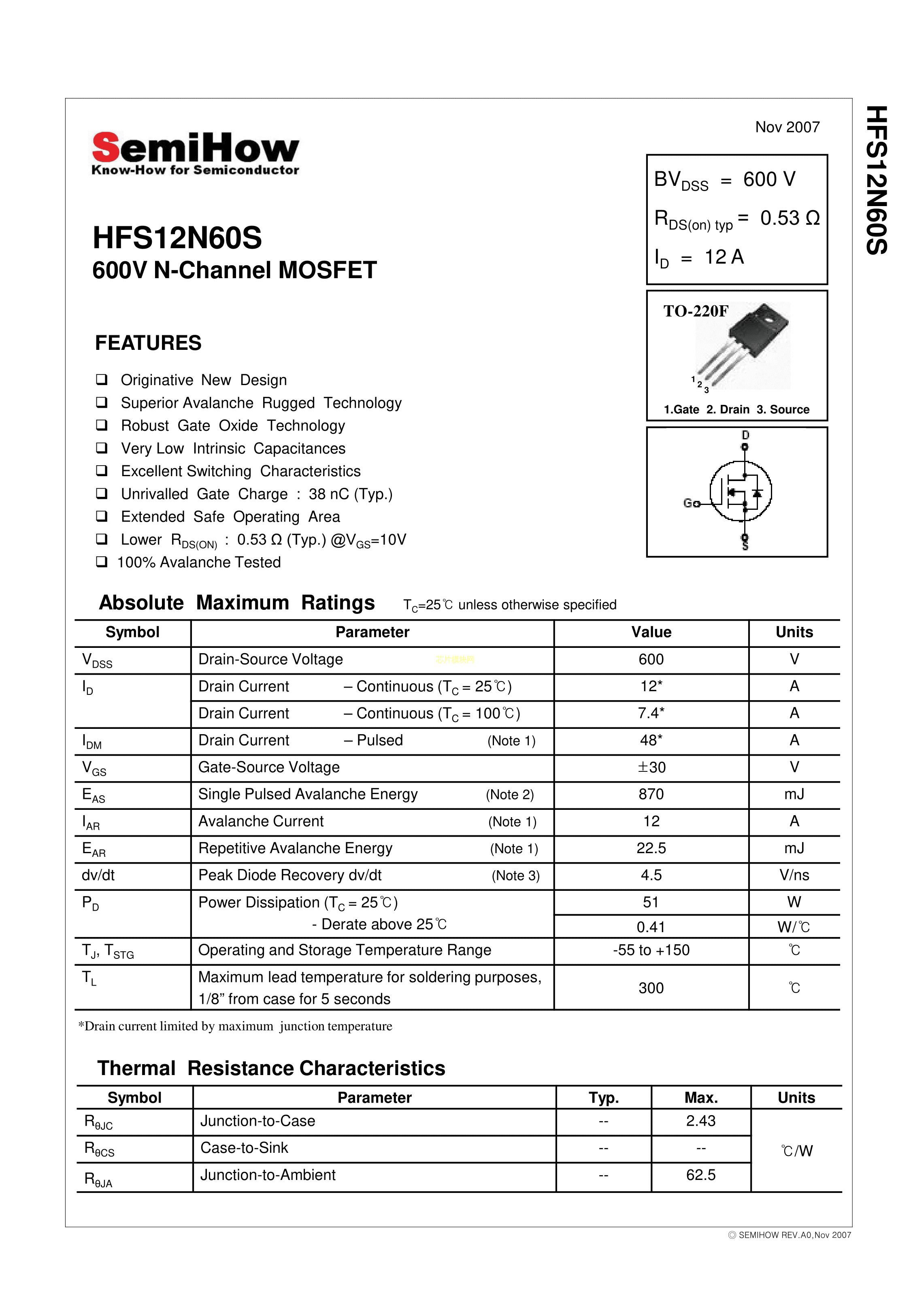 HFS12N60S数据手册TO-220F封装SemiHowPDF规格书,中英文下载