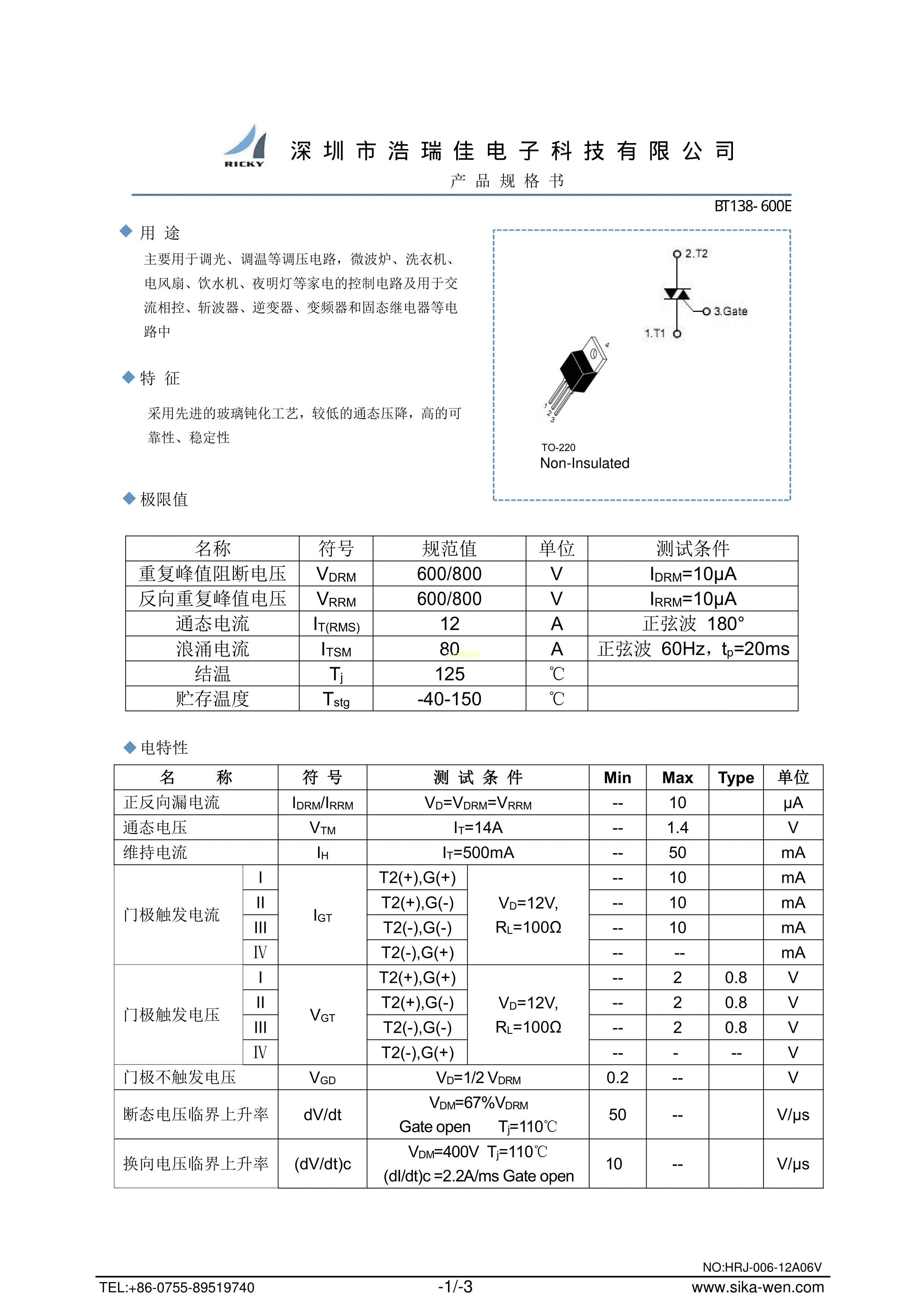 BT138-600E数据手册TO-220封装RICKYPDF规格书,中英文下载