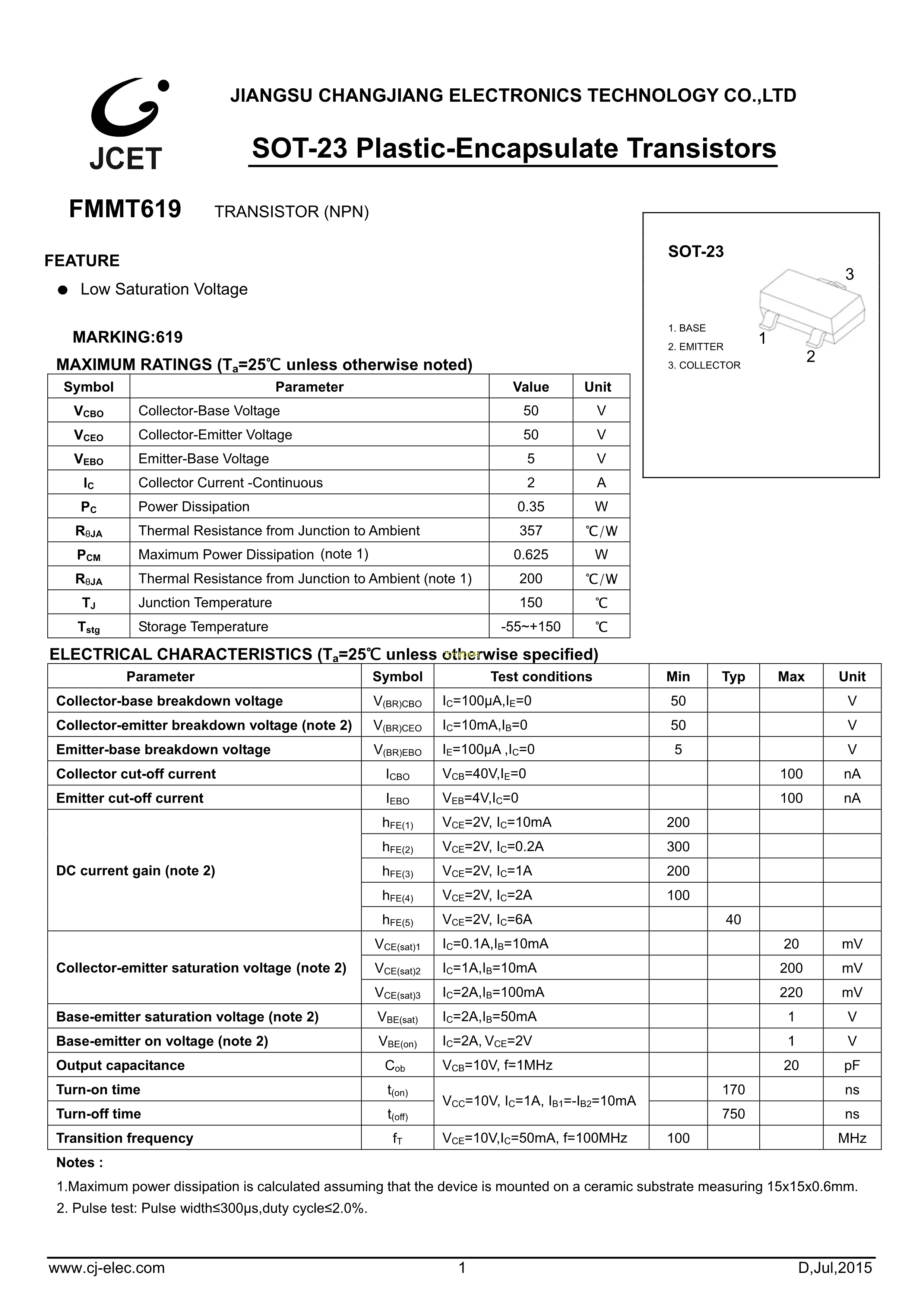 FMMT619数据手册SOT-23(SOT-23-3)封装CJ(江苏长电-长晶)PDF规格书,中英文