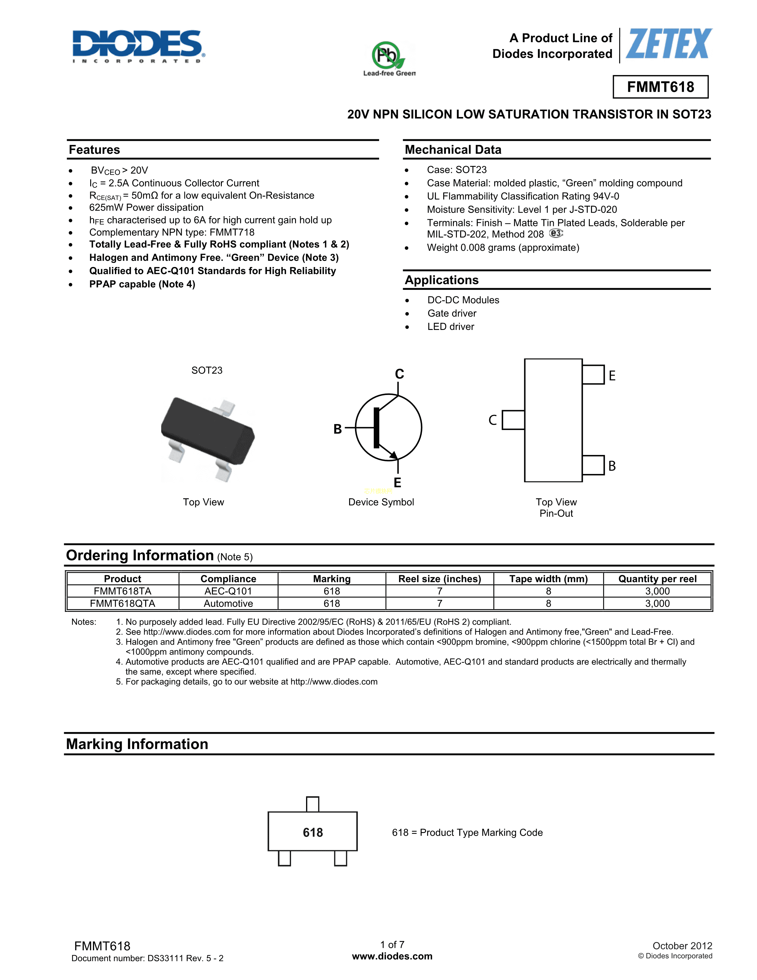 FMMT618TA数据手册SOT-23-3封装DIODES(美台)PDF规格书,中英文下载