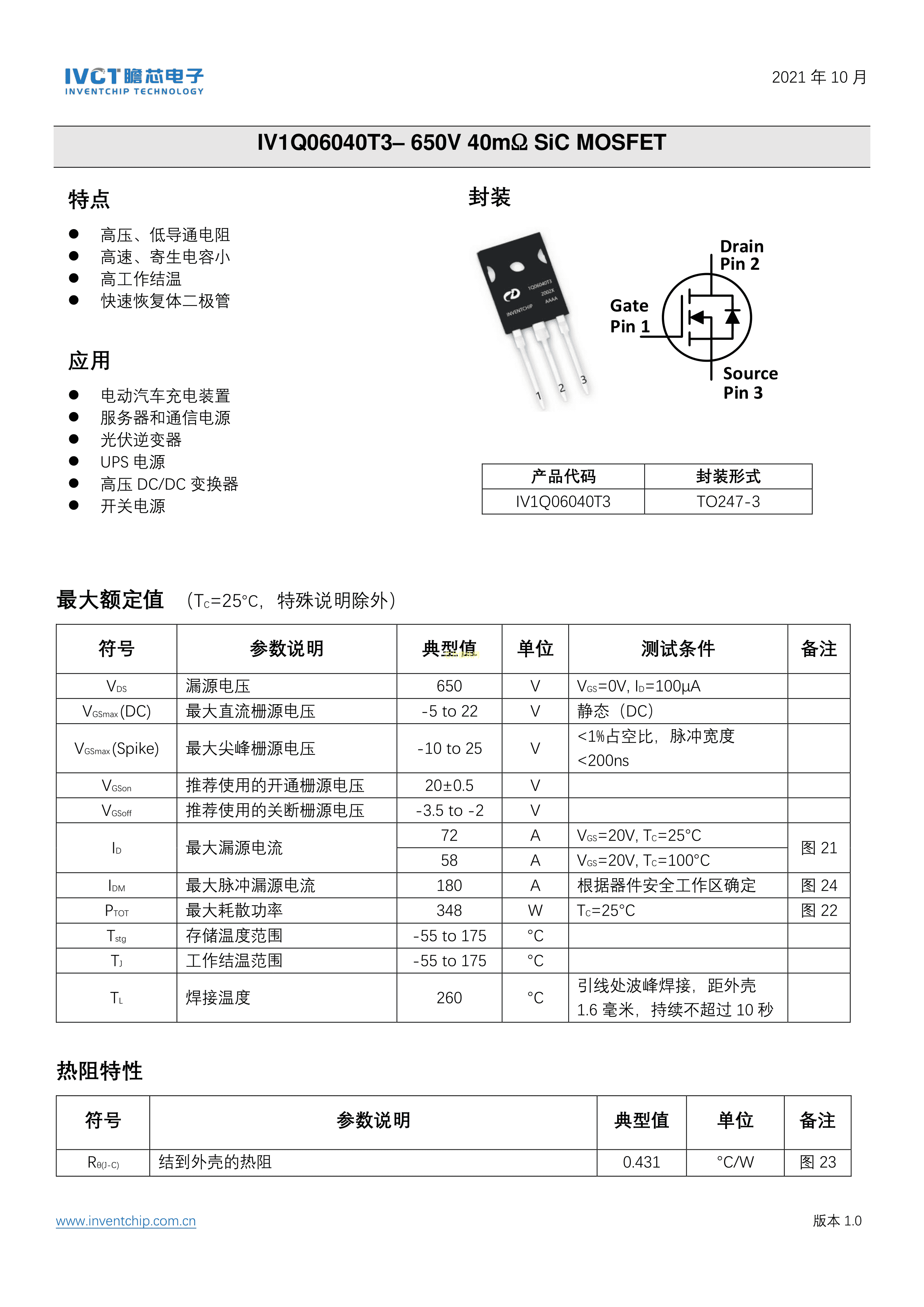 IV1Q06040T3数据手册TO247-3封装inventchip(瞻芯电子)PDF规格书,中英文