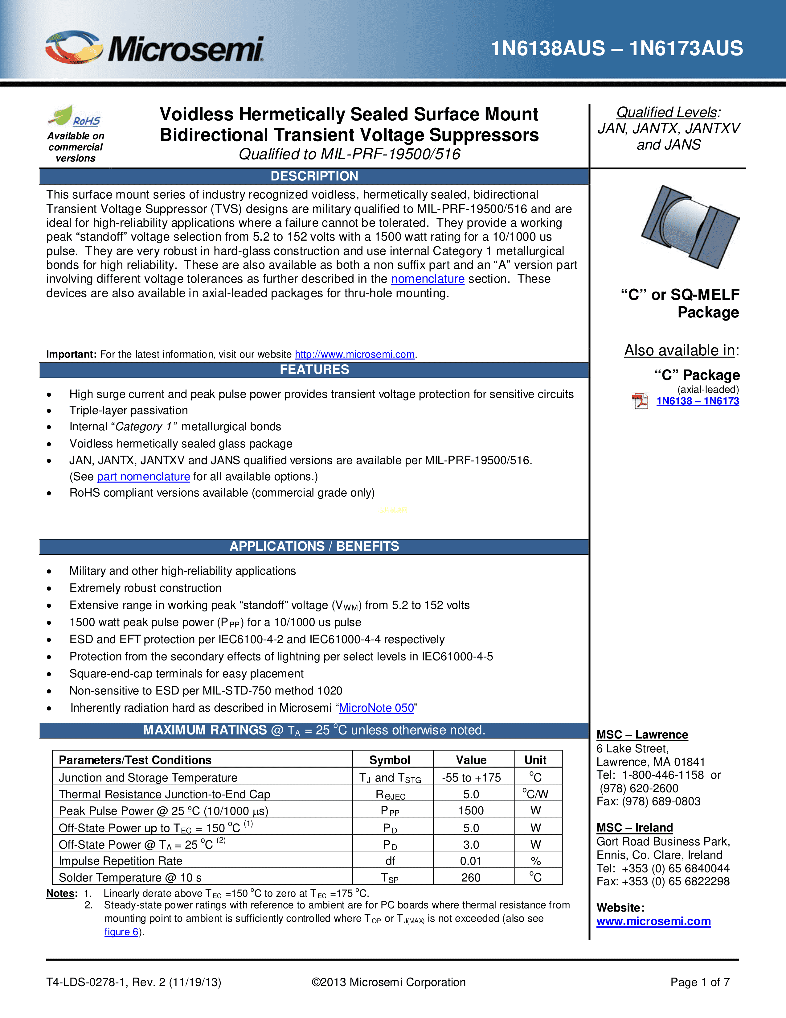 JANTX1N6155US数据手册C-SQ-MELF封装Microsemi(美高森美)PDF规格书,
