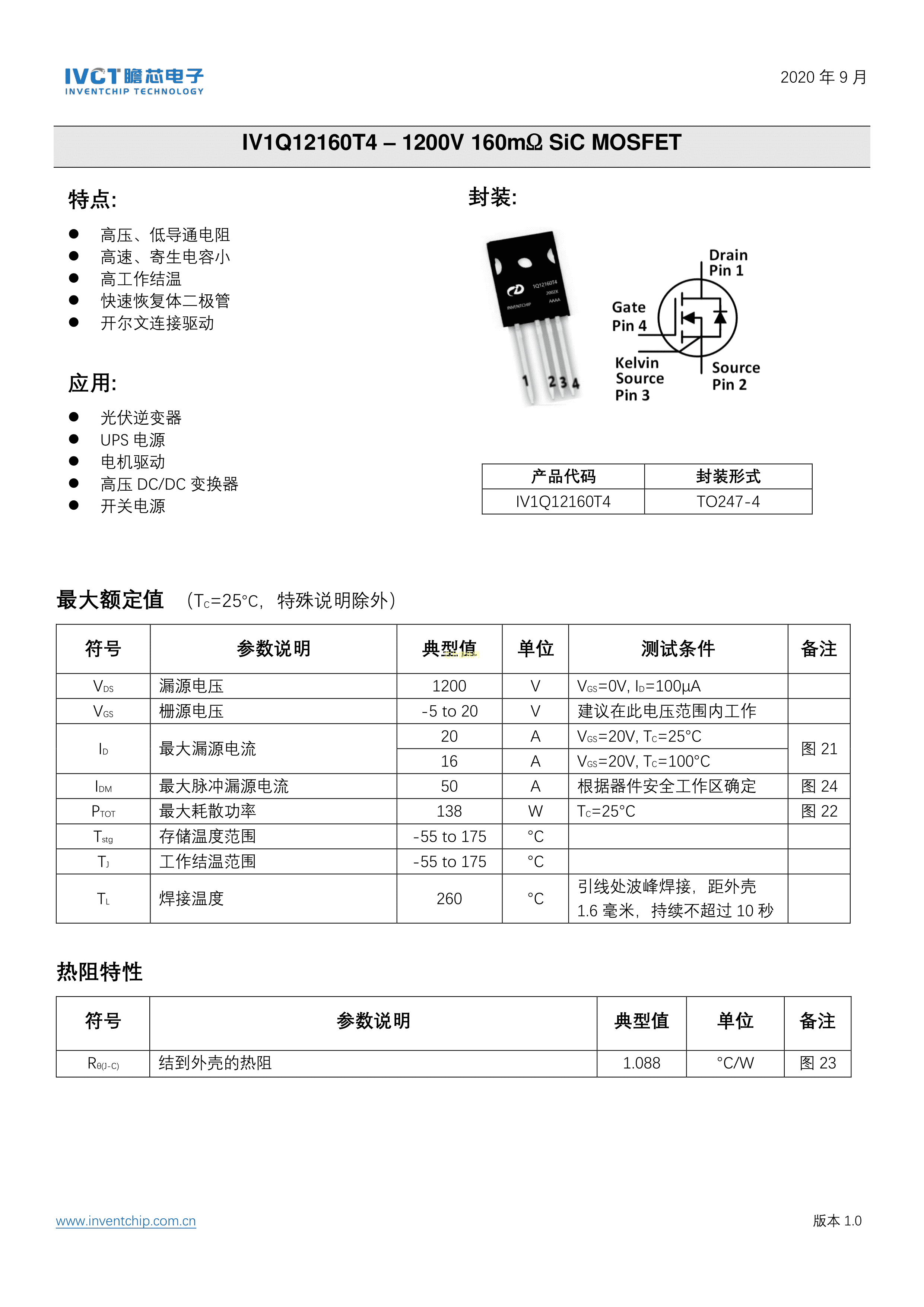IV1Q12160T4数据手册TO247-4封装inventchip(瞻芯电子)PDF规格书,中英文