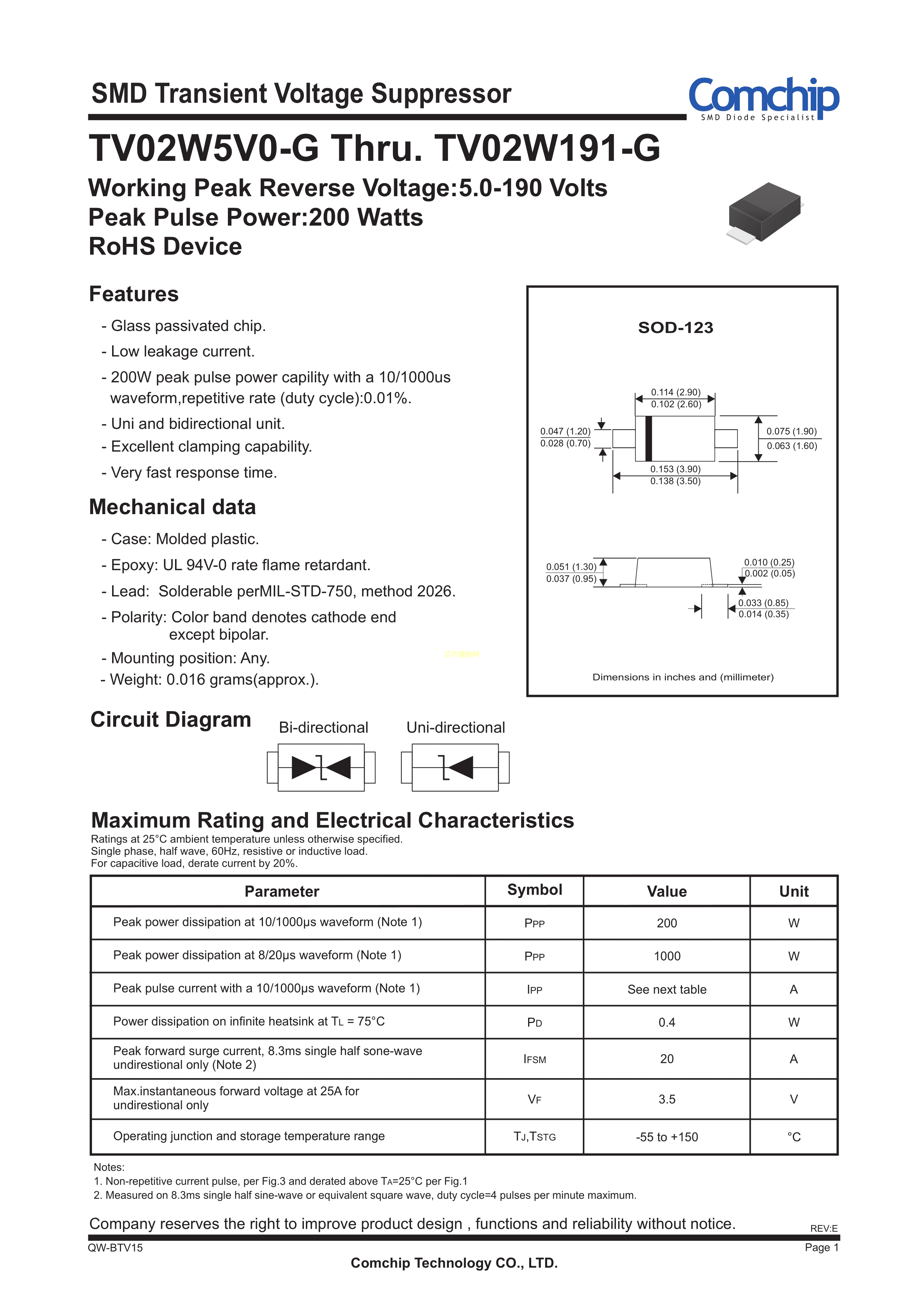 TV02W190-G数据手册SOD-123封装Comchip Technology(典琦)PDF规格