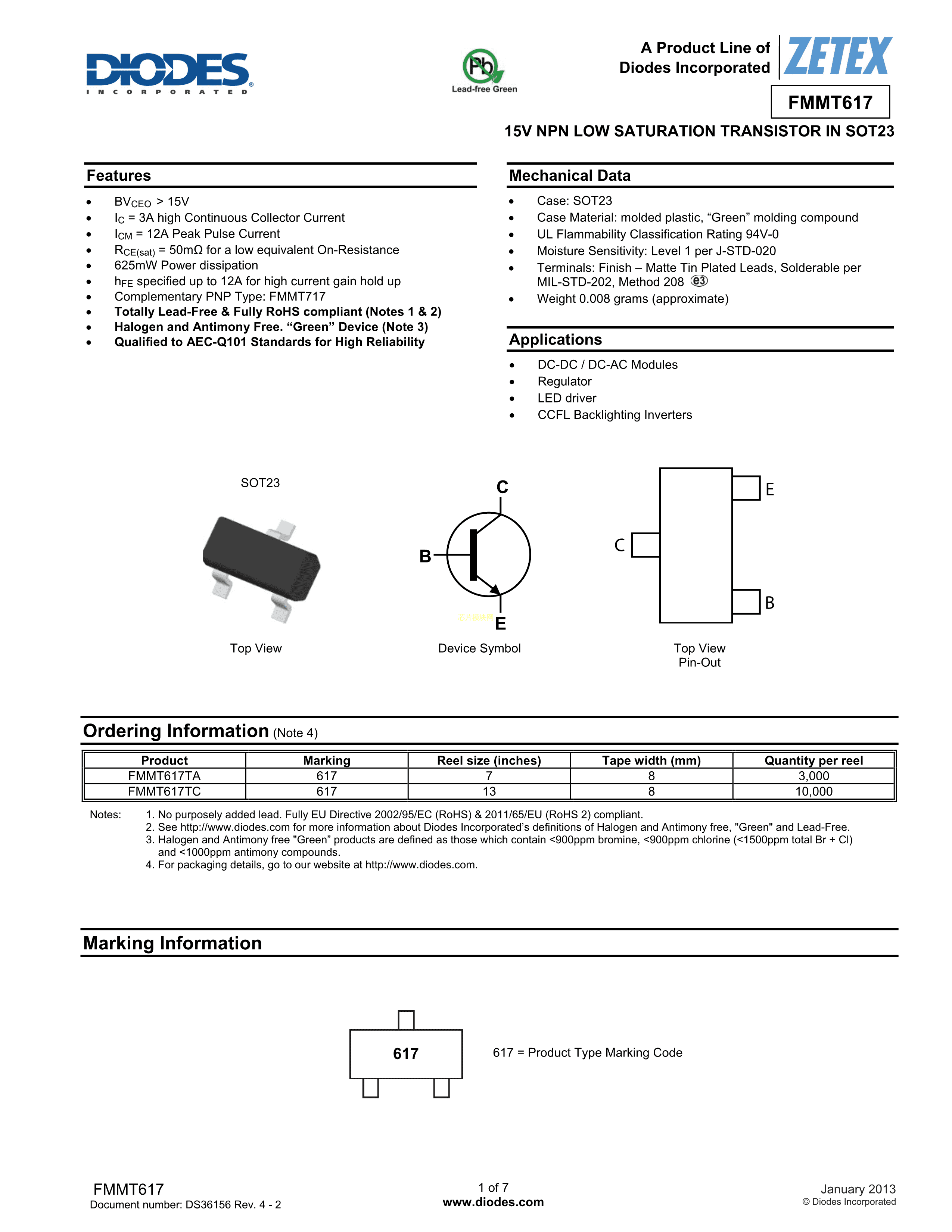 FMMT617TA数据手册SOT-23(SOT-23-3)封装DIODES(美台)PDF规格书,中英