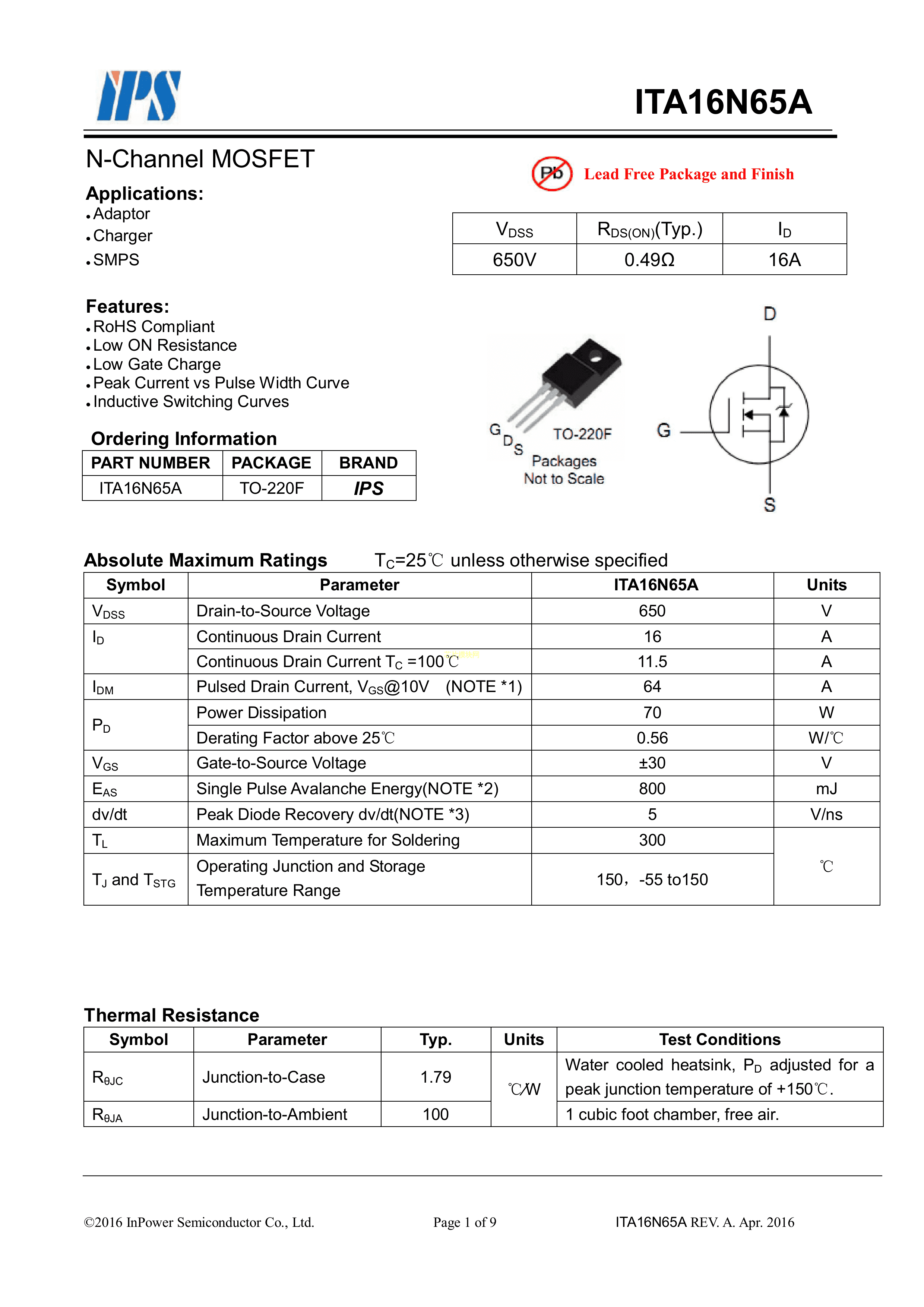 ITA16N65A数据手册TO-220F封装CRMICRO(华润微)PDF规格书,中英文下载