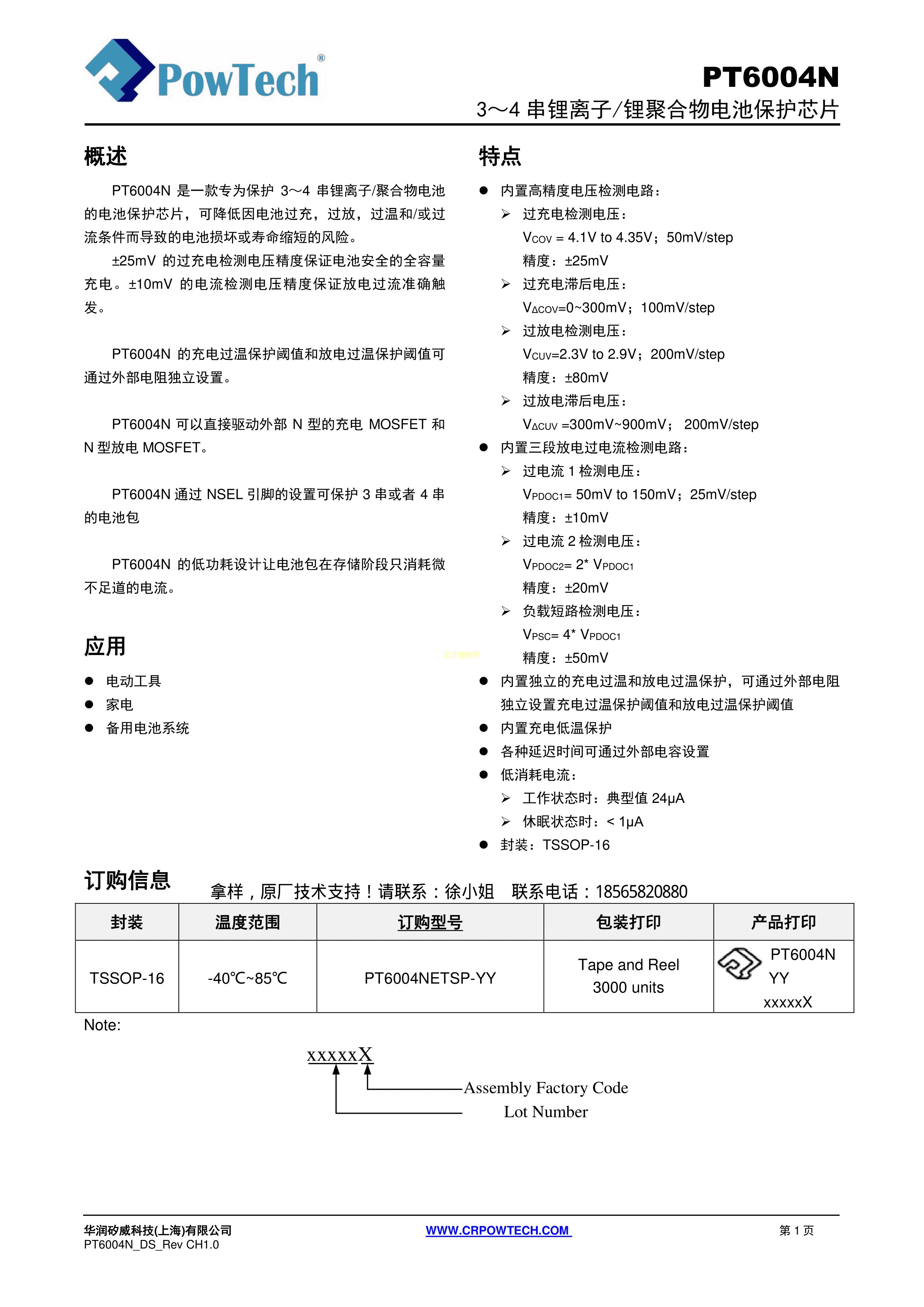 PT6004NETSP-AA数据手册TSSOP-16封装PowTech(华润矽威)PDF规格书,中英