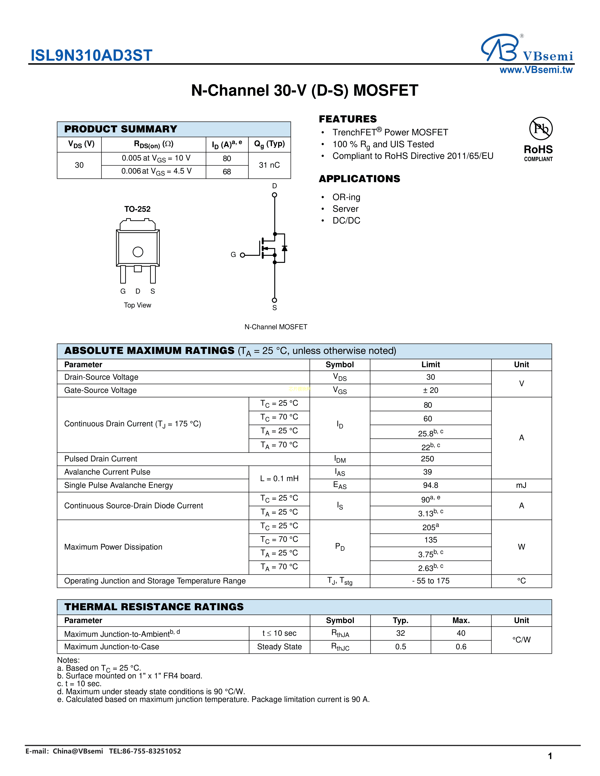 ISL9N310AD3ST数据手册TO-252封装VBsemi(台湾微碧)PDF规格书,中英文下载