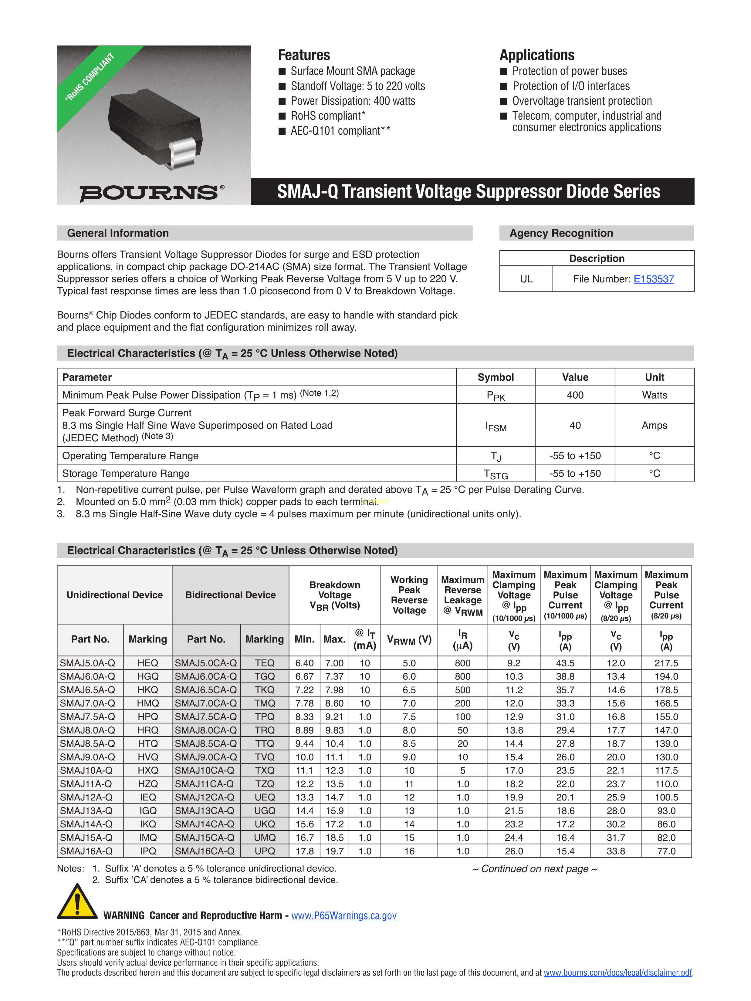 SMAJ16CA-Q数据手册SMA(DO-214AC)封装BOURNSPDF规格书,中英文下载