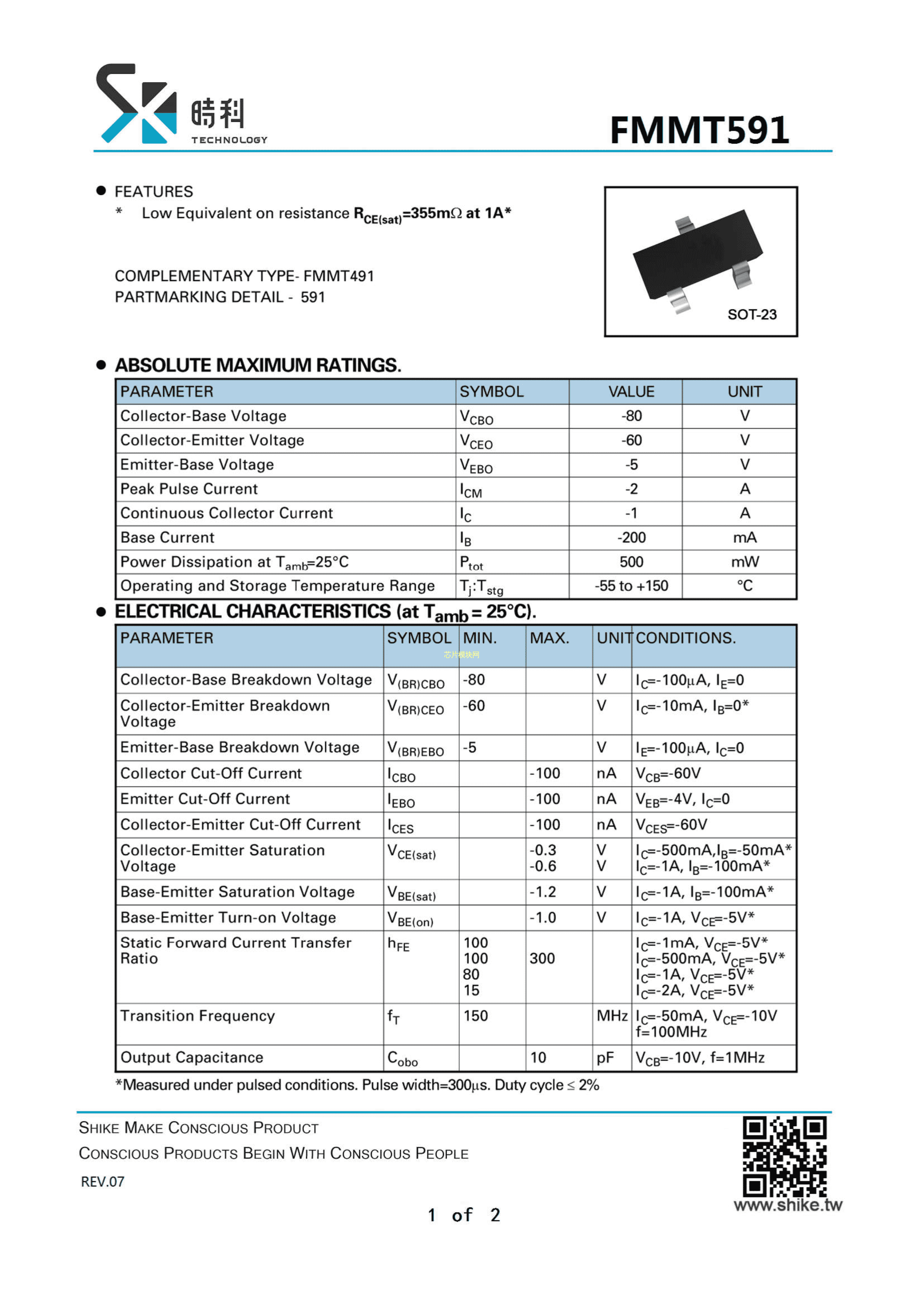 FMMT591数据手册SOT-23(SOT-23-3)封装SHIKUES(时科)PDF规格书,中英文