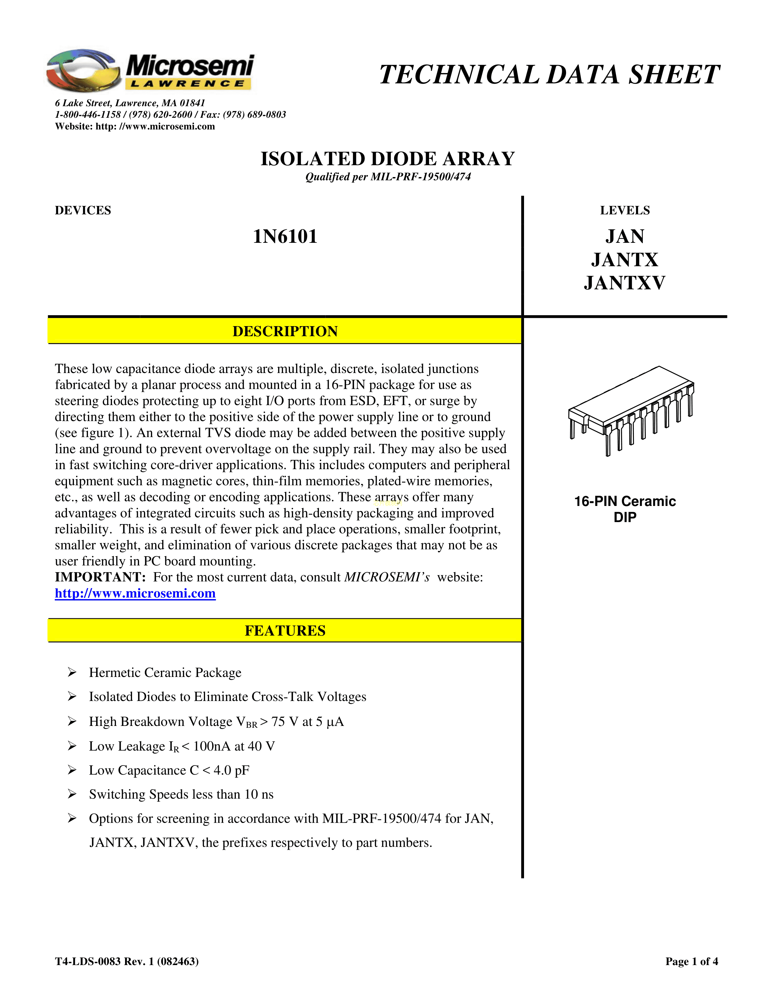 JANTX1N6101数据手册CDIP-16封装Microsemi(美高森美)PDF规格书,中英文下