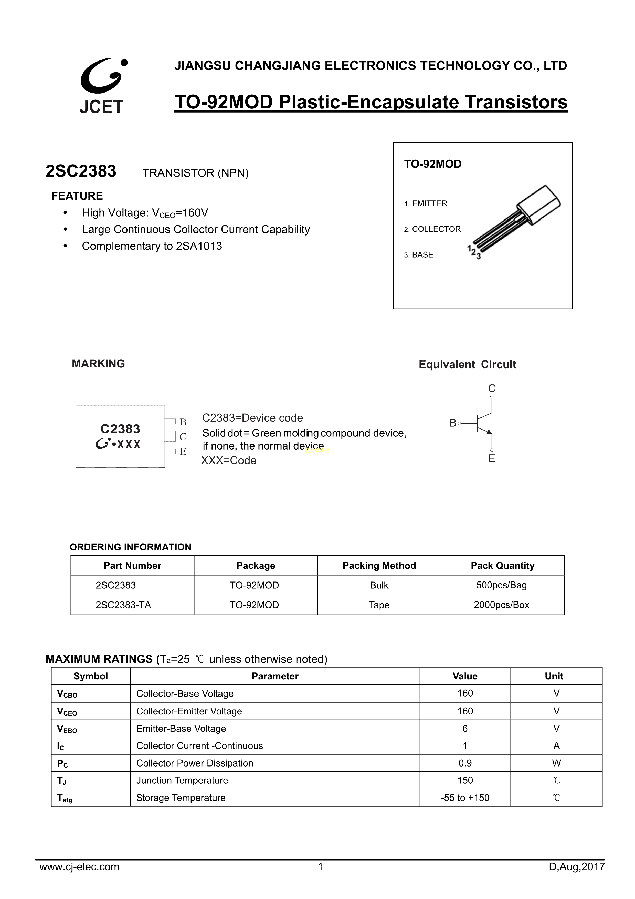 2SC2383数据手册TO-92MOD封装CJ(江苏长电-长晶)PDF规格书,中英文下载