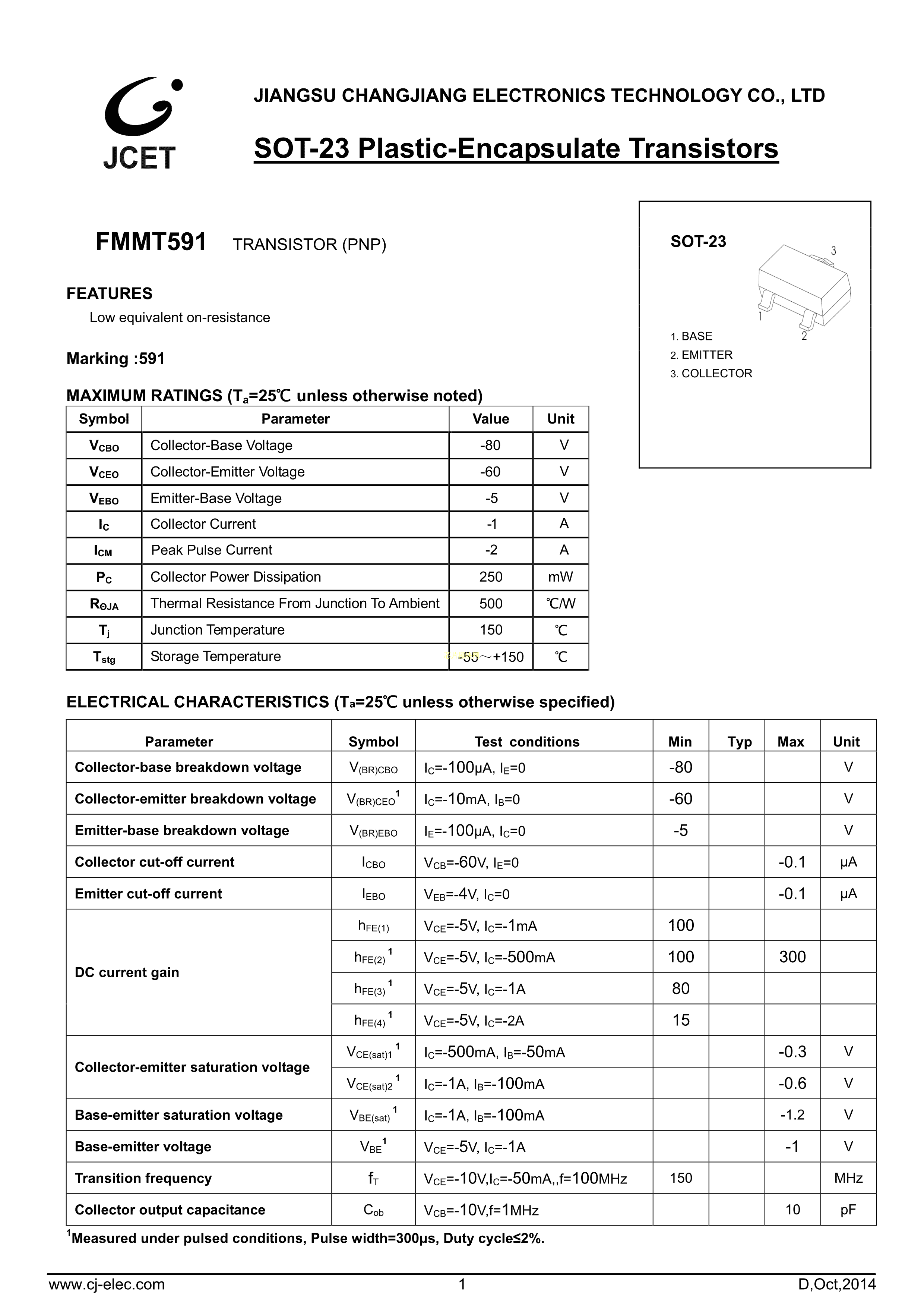 FMMT591数据手册SOT-23(SOT-23-3)封装CJ(江苏长电-长晶)PDF规格书,中英文