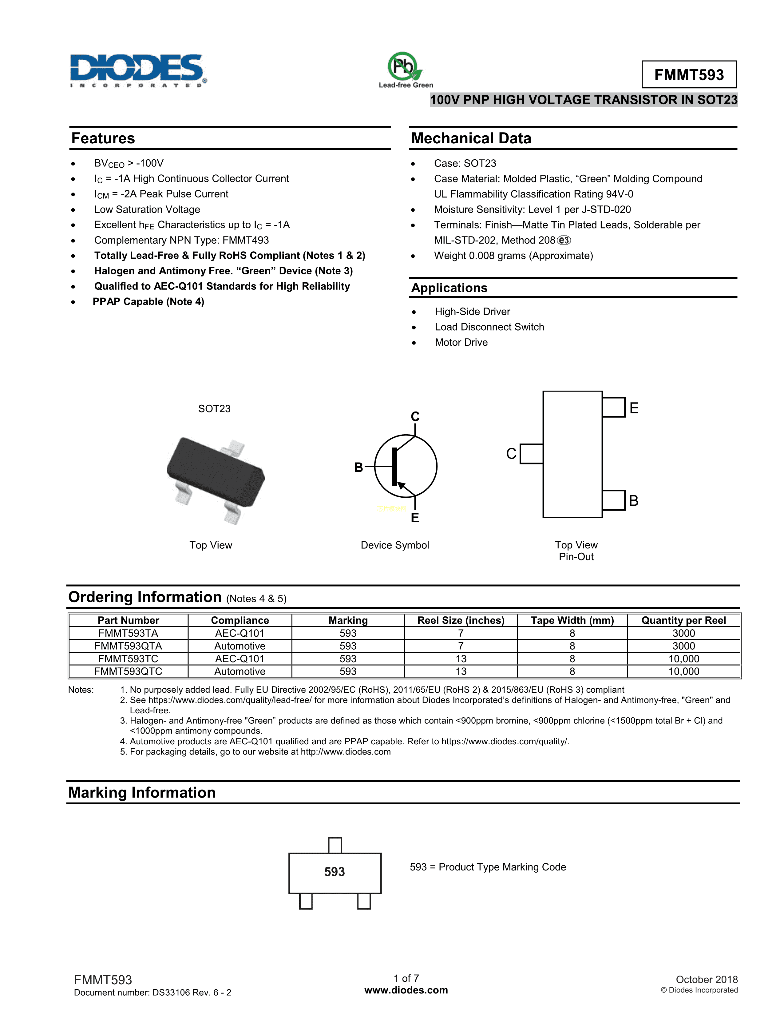 FMMT593TA数据手册SOT-23-3封装DIODES(美台)PDF规格书,中英文下载