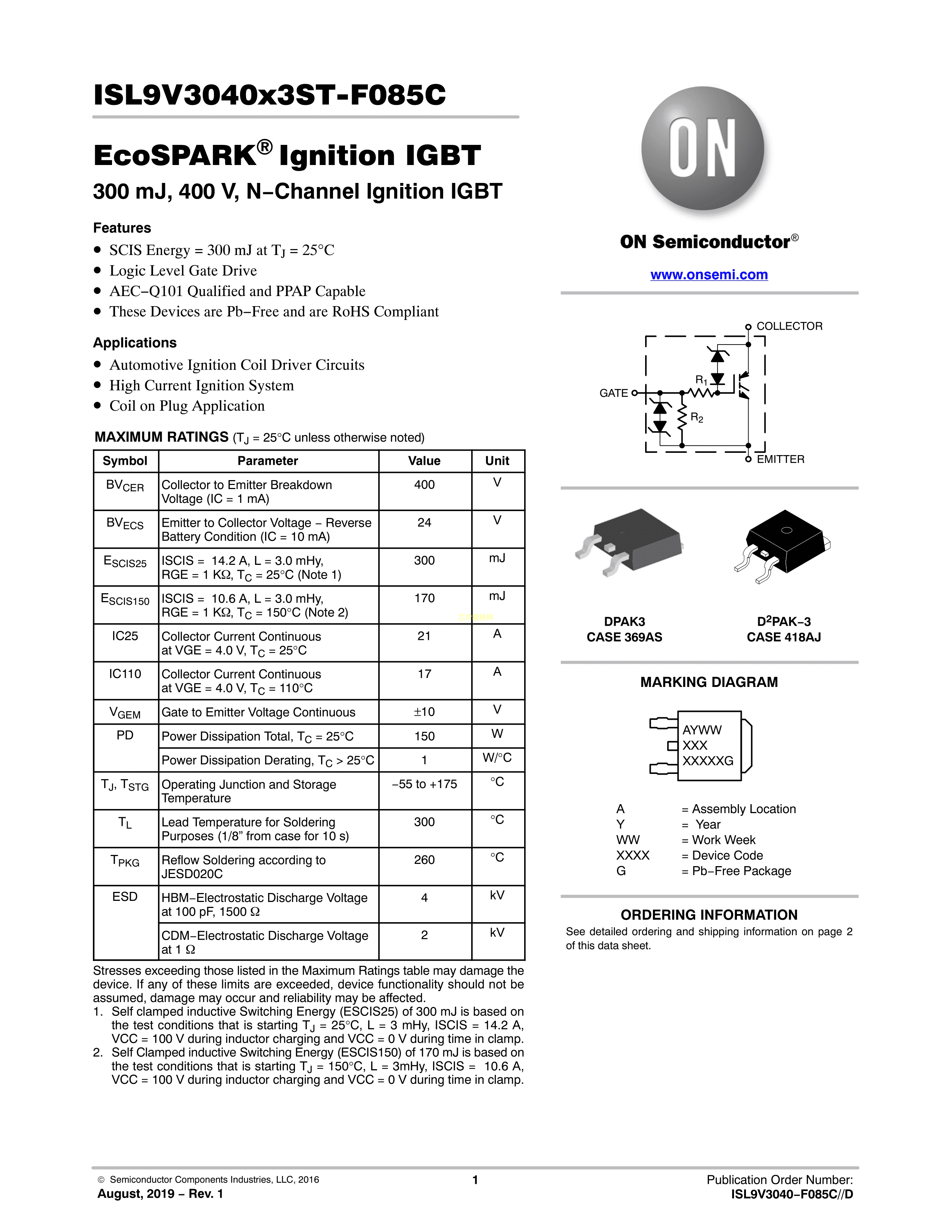 ISL9V3040S3ST-F085C数据手册D2PAK封装onsemi(安森美)PDF规格书,中英