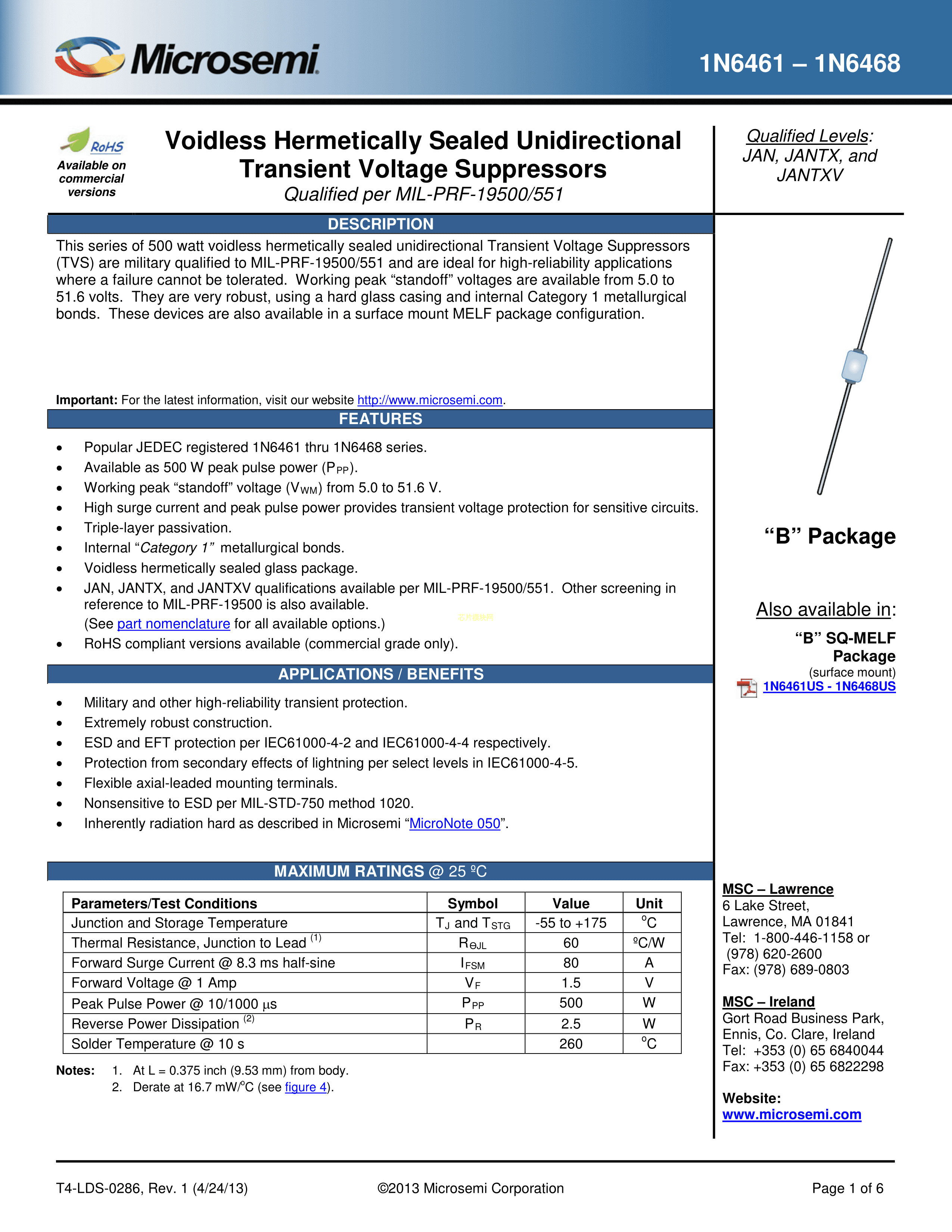 JAN1N6465数据手册Axial封装Microsemi(美高森美)PDF规格书,中英文下载