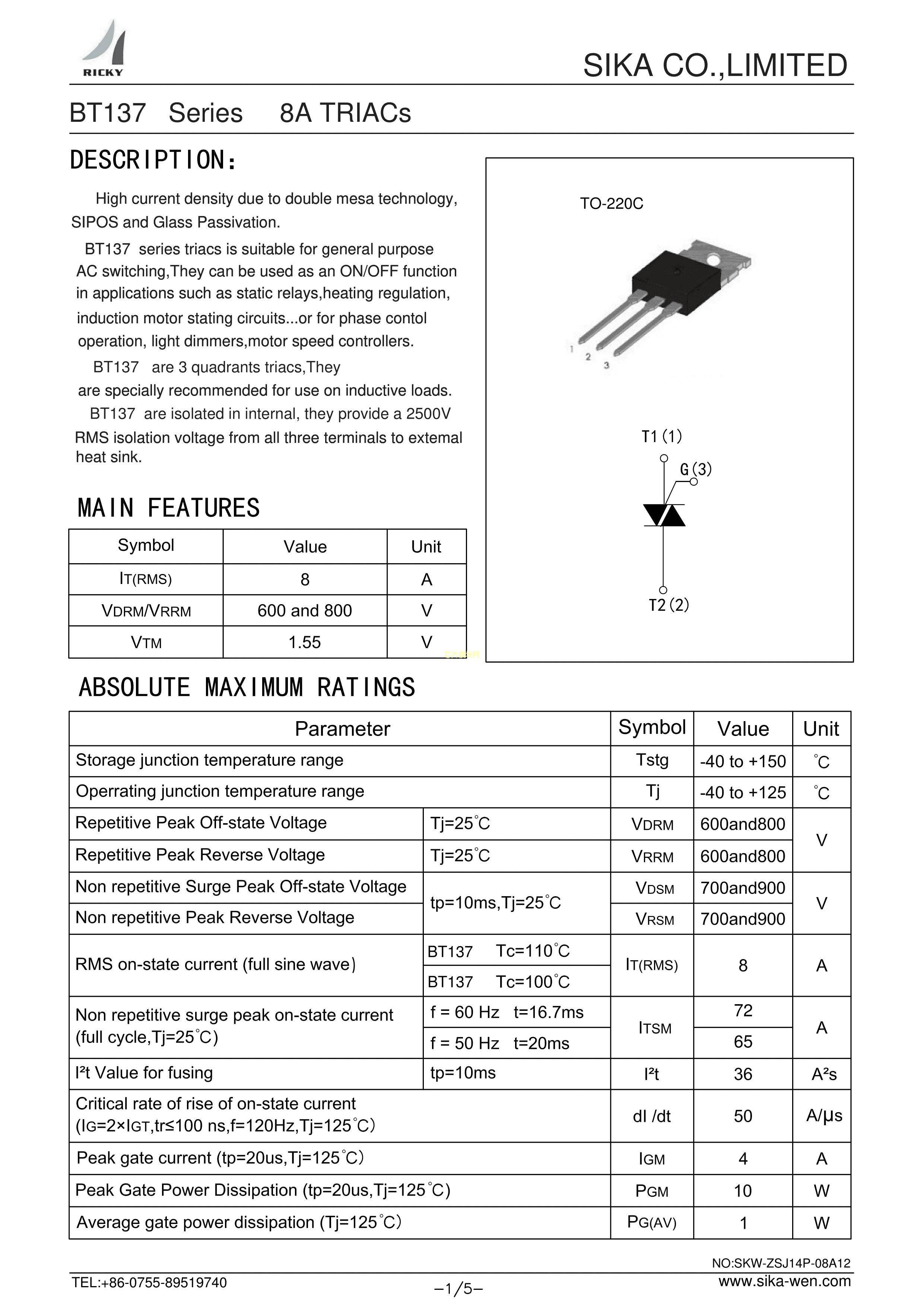 BT137-600D数据手册TO-220C封装RICKYPDF规格书,中英文下载