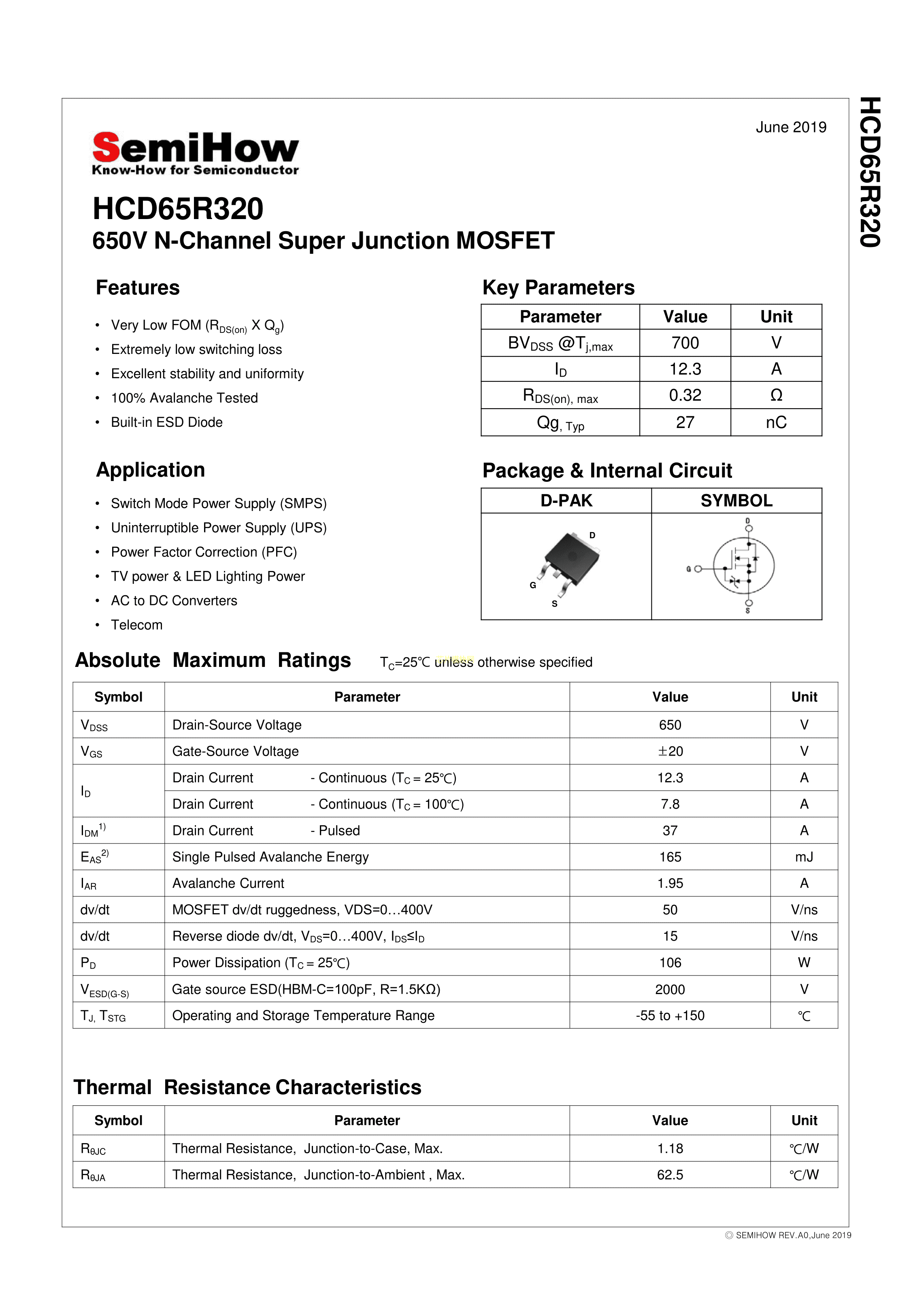 HCD65R320数据手册TO-252封装SemiHowPDF规格书,中英文下载