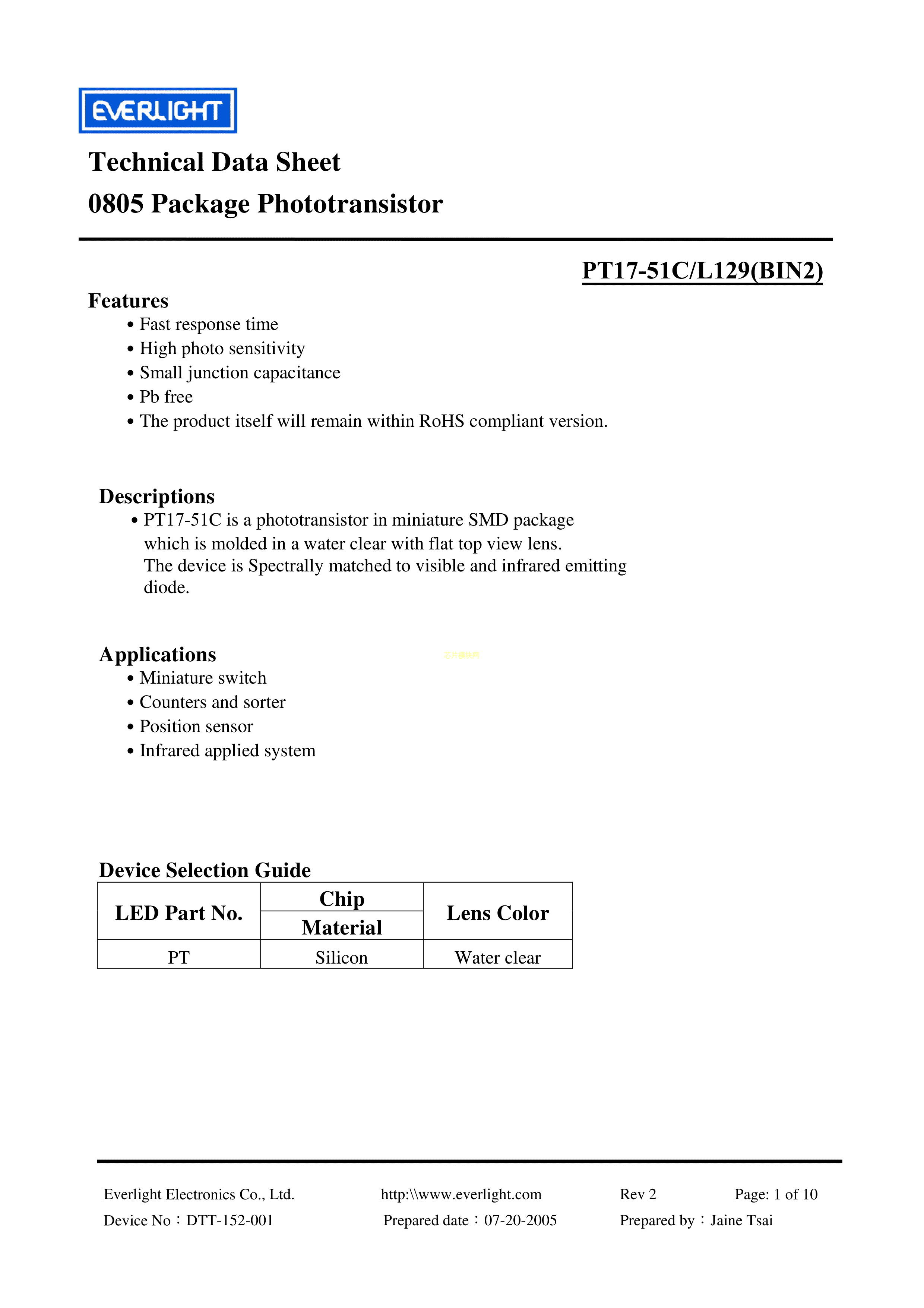 PT17-51C-L129(BIN2)数据手册0805封装EVERLIGHT(台湾亿光)PDF规格书,中英文下载
