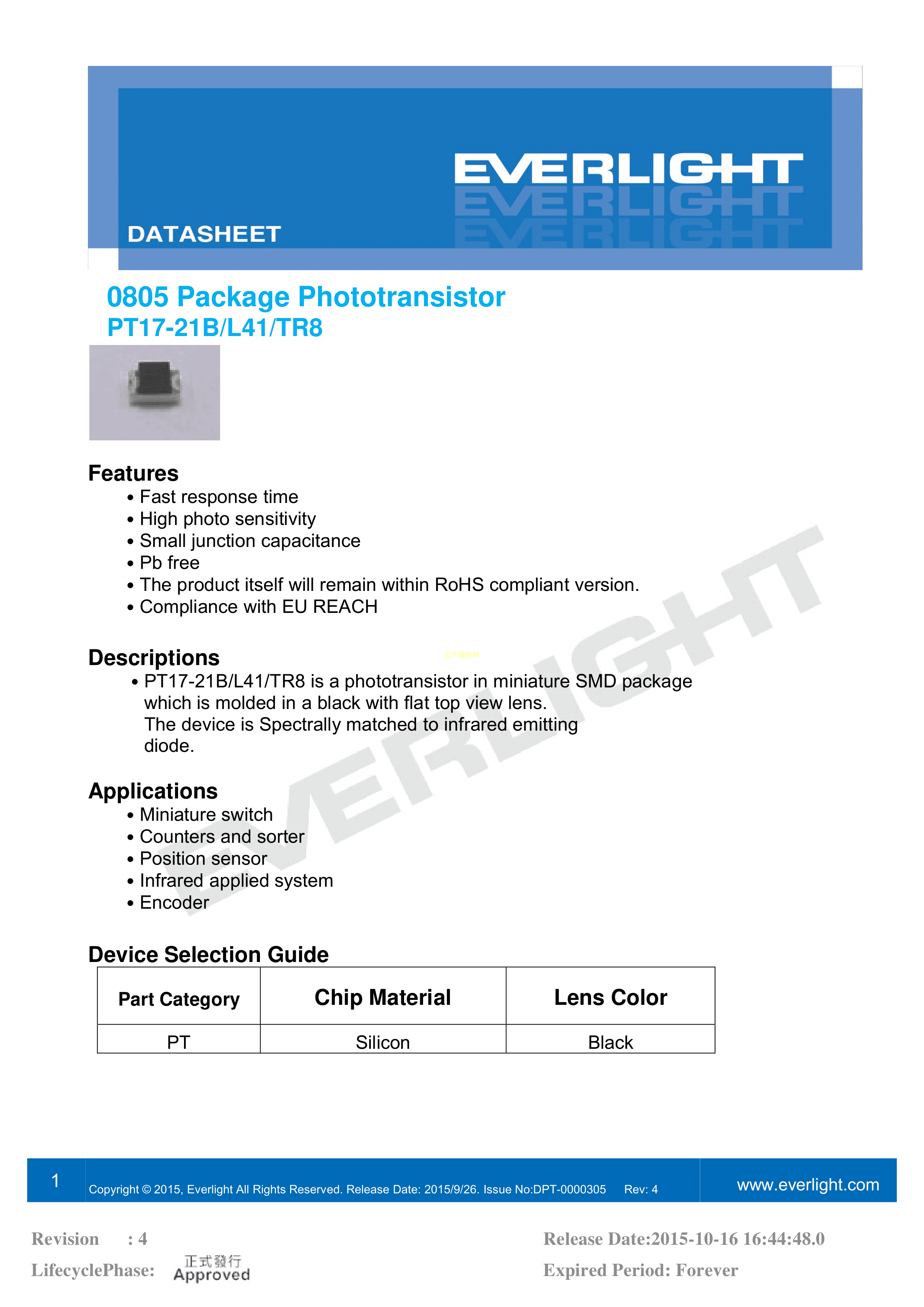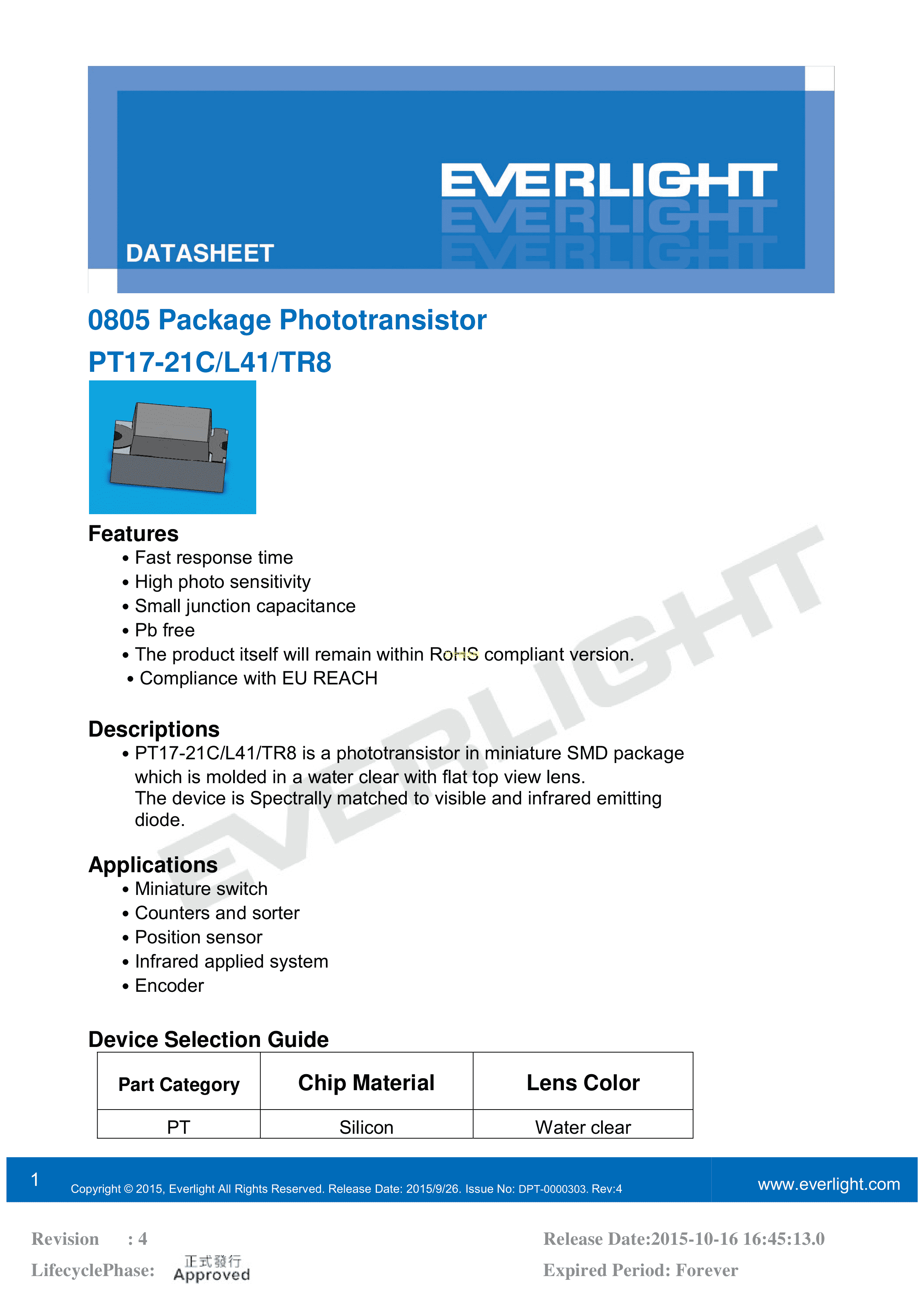 PT17-21C-L41-TR8数据手册0805封装EVERLIGHT(台湾亿光)PDF规格书,中英文下载