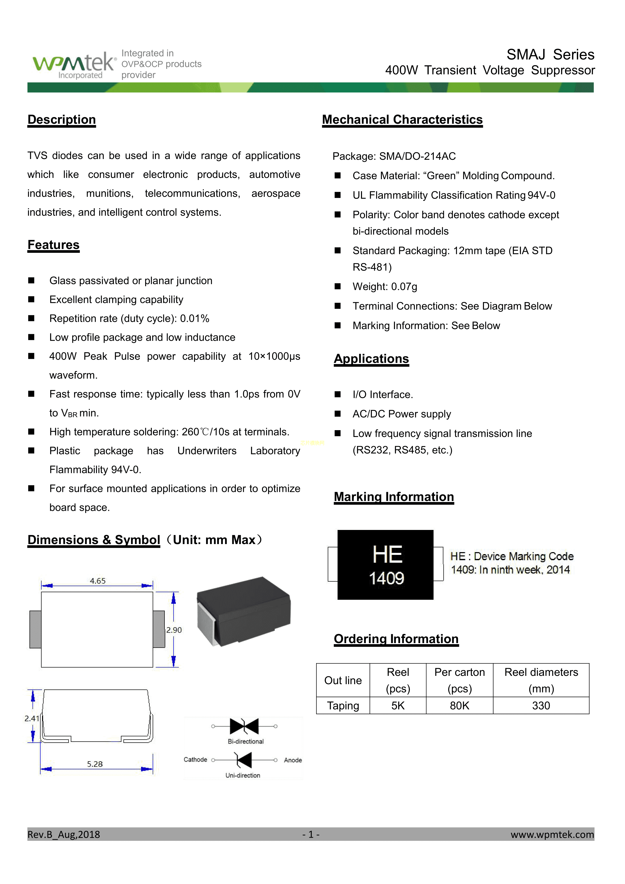 SMAJ15A数据手册SMA封装WPMtek(维攀微)PDF规格书,中英文下载