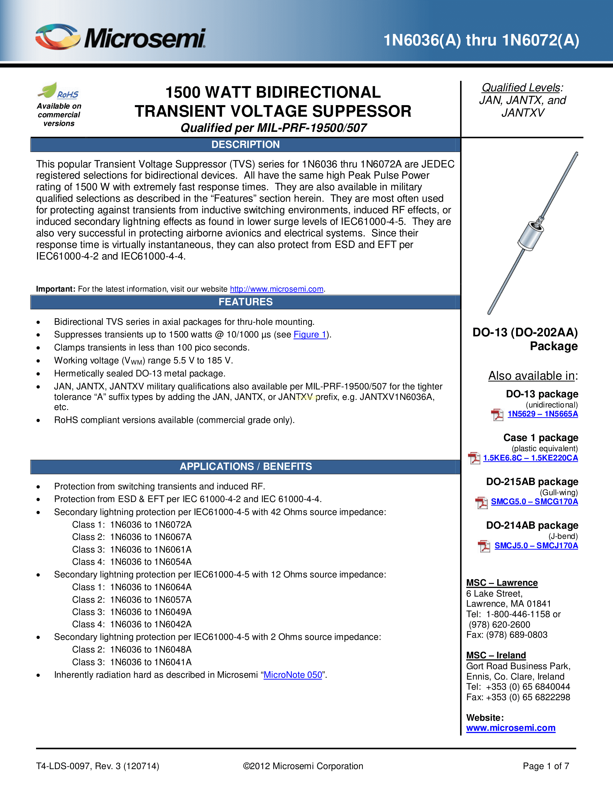 JAN1N6069A数据手册DO-13(DO-202AA)封装Microsemi(美高森美)PDF规