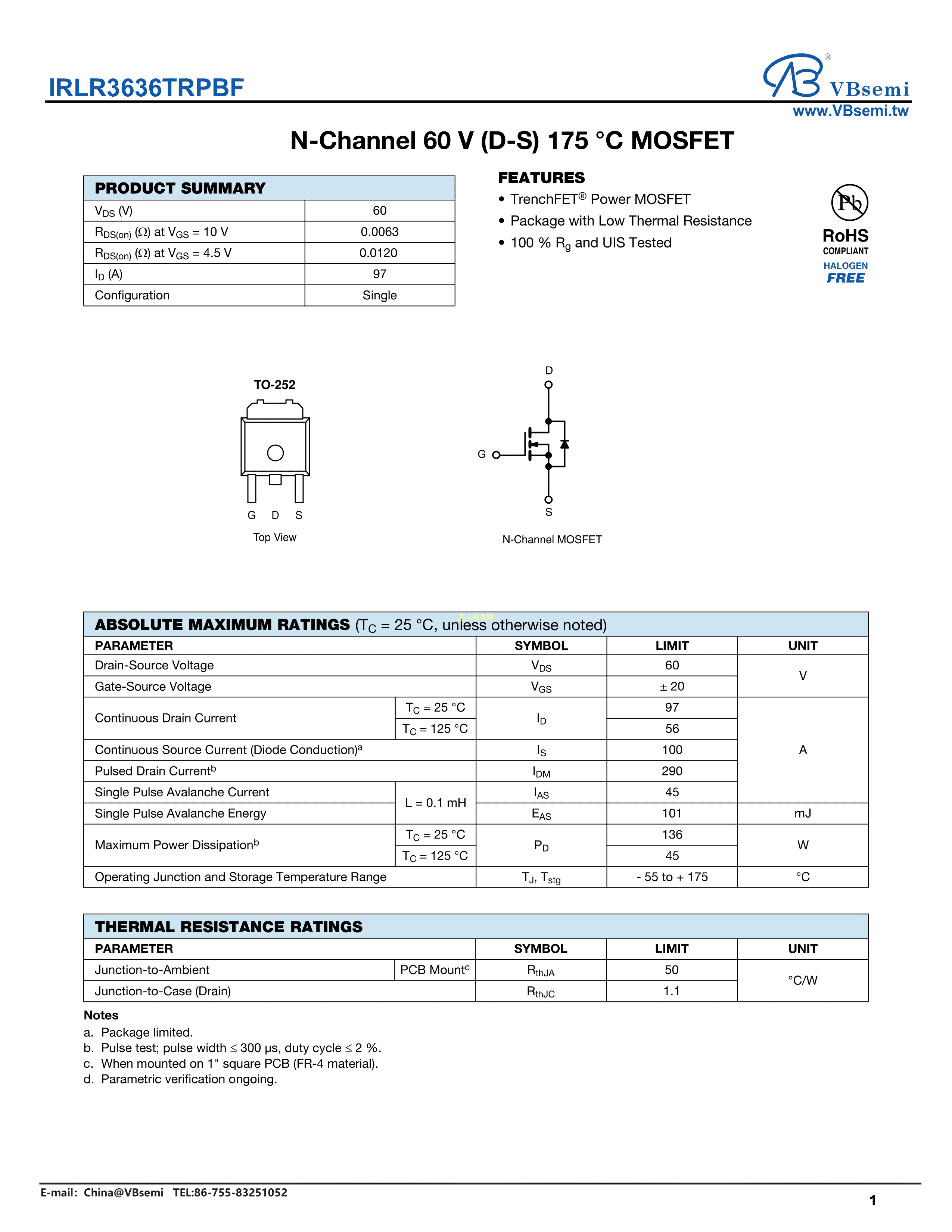 IRLR3636TRPBF数据手册TO-252封装VBsemi(台湾微碧)PDF规格书,中英文下载