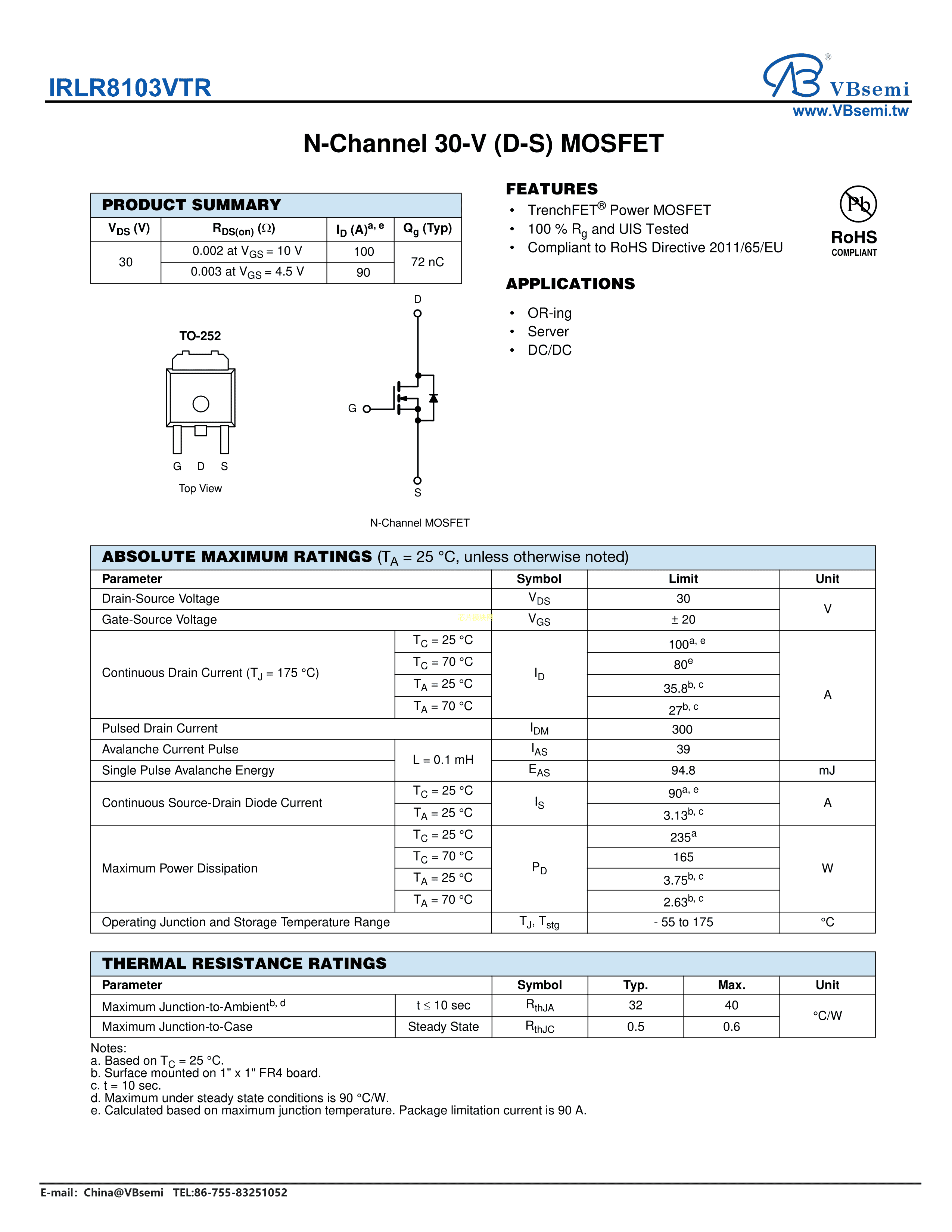 IRLR8103VTR数据手册TO-252封装VBsemi(台湾微碧)PDF规格书,中英文下载